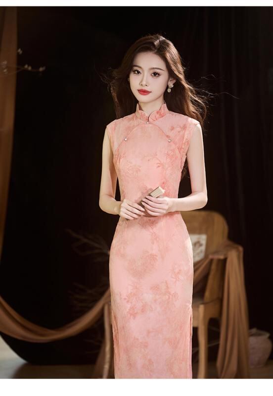 チャイナドレス ノースリーブ スタイリッシュ レディース 中国風 ピンク色 新 ロング丈 ワンピース ドレス 女性用 夏 夏物 個性的 性 上品 高級感 エレガント 礼服 フォーマル パーティードレス