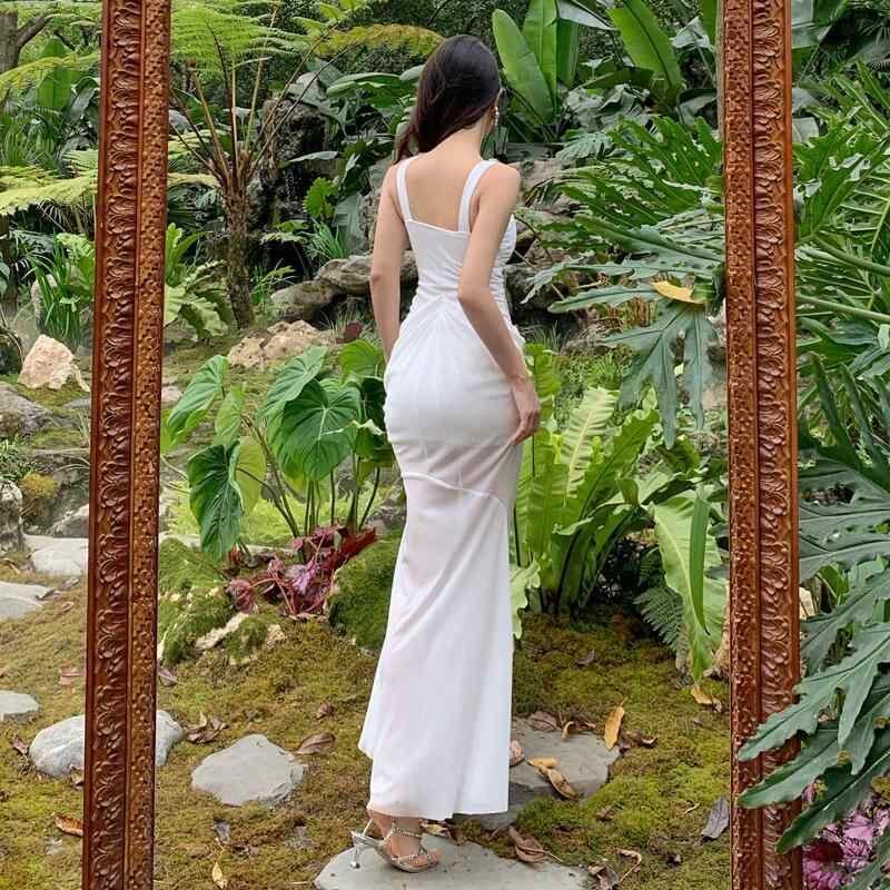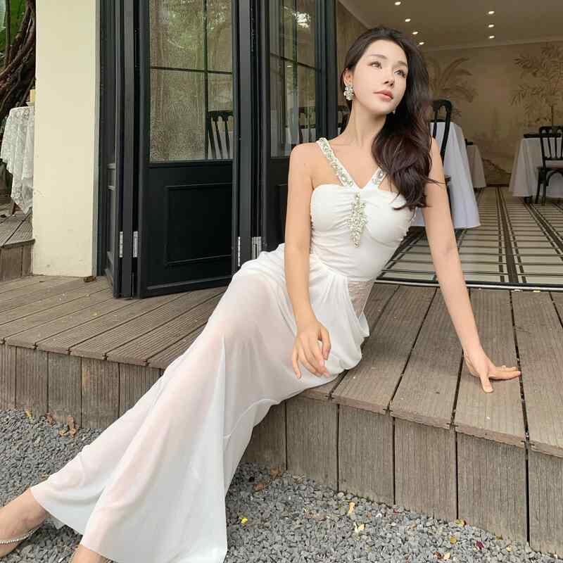 ワンピース レディース マーメイド ロング ノースリーブ ハイウエスト ポリエステル エレガント ドレス リゾート パーティードレス 白