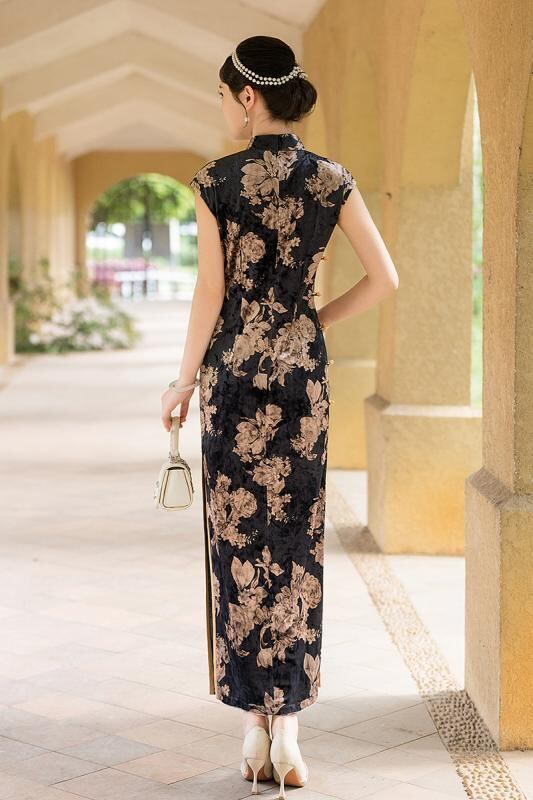 チャイナドレス レディース 黒 ベルベット 新中式 レトロ 高伸縮性 ロング丈 ノースリーブ ハイウエストスリット 春夏 普段使い