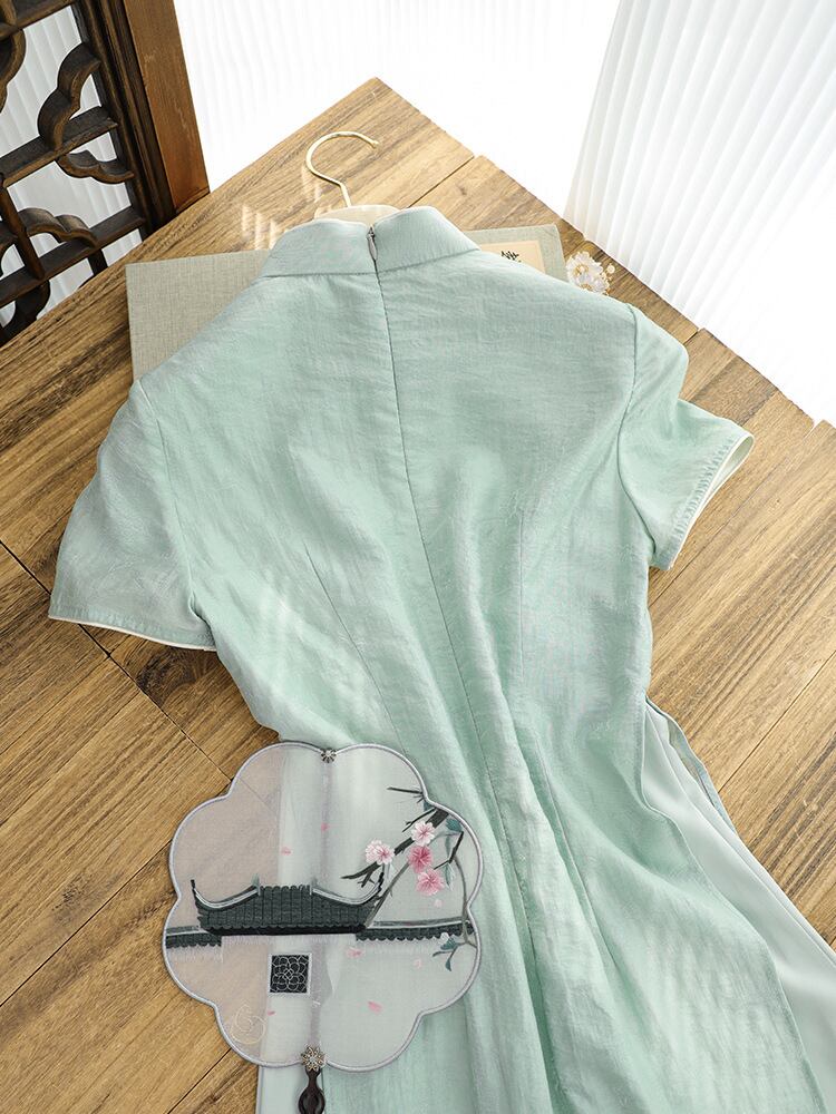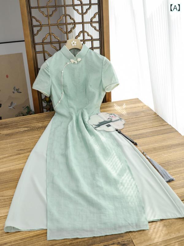 チャイナドレス レディース 緑 エレガント 上品 新チャイナ風 モダンチャイナ 改良 レトロ 普段使い ロング丈 スタンドカラー 斜め襟 切り替え ポリエステル アオザイ ワンピース ドレス 春夏