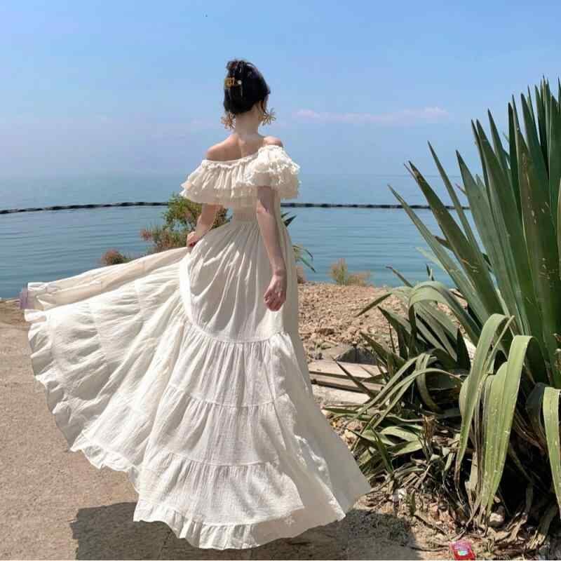 ワンピース レディース エスニック リゾート フレンチスタイル 純綿 コットン エレガント ボリューム フレア Aライン 切りっぱなしデザイン キャミソール ハイウエスト ミディ丈 オフホワイト