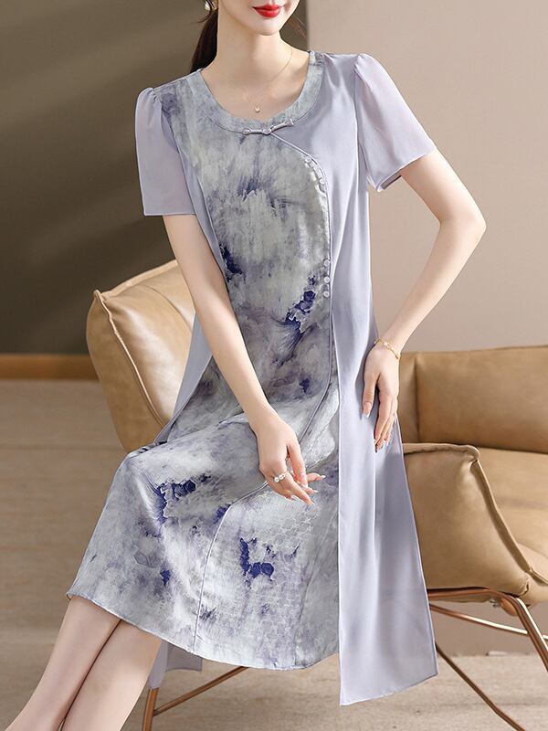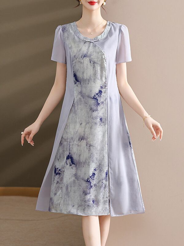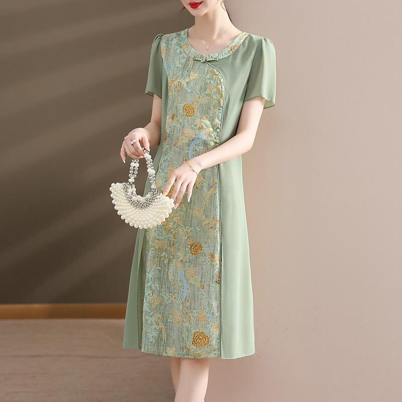 ワンピース レディース ママ ミセス シフォン素材 花柄 半袖 夏 体型カバー Aライン フレア リゾート 旅行 お出かけ カジュアル ミディ丈 ラウンドネック ウエストリボン シワになりにくい ポリエステル