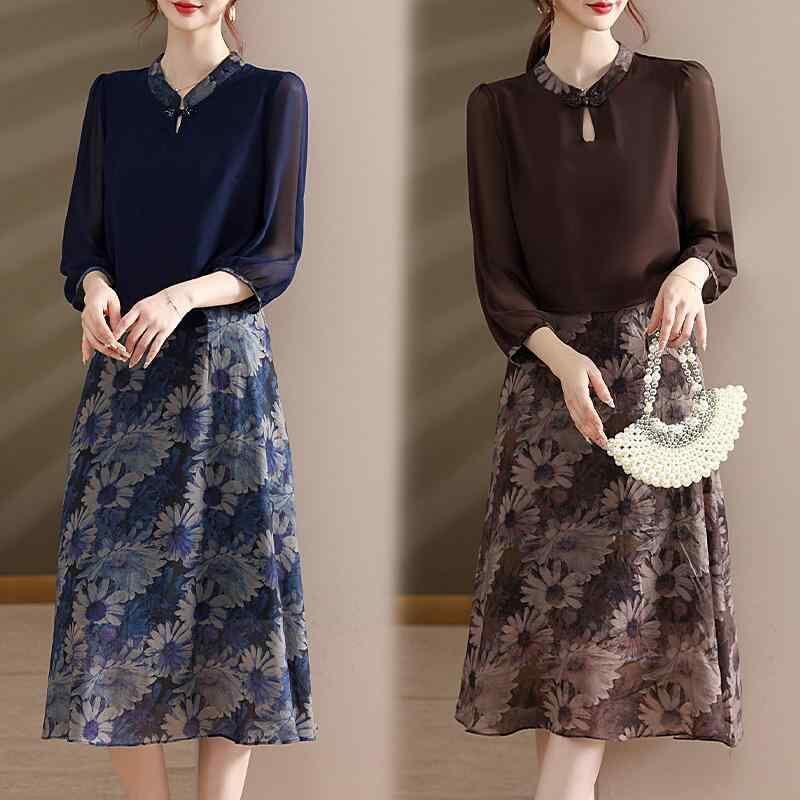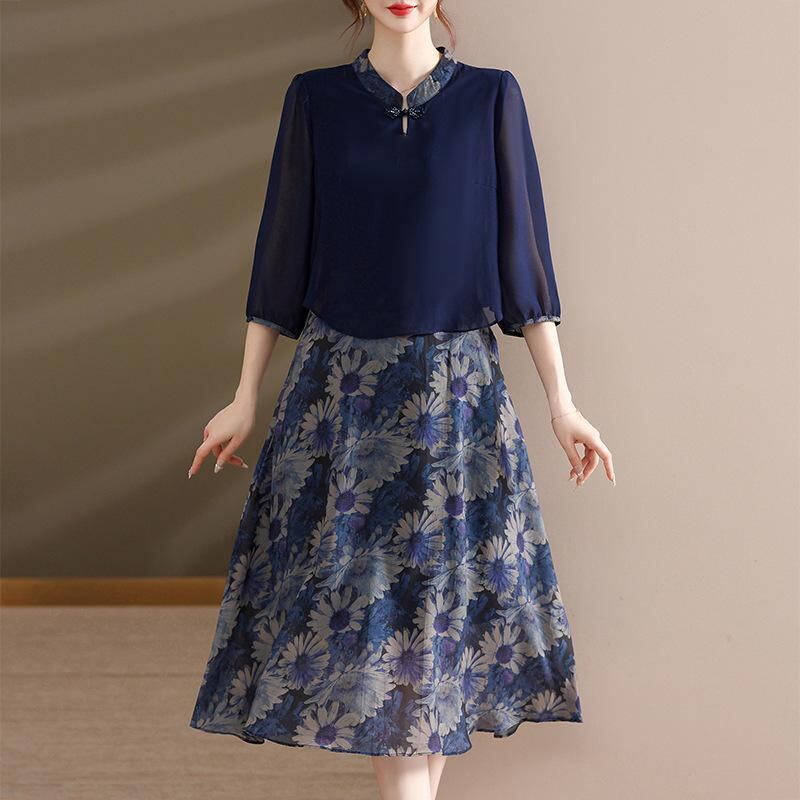 ワンピース ミセス 女性 春夏 モダンチャイナ風 シフォン 重ね着風 小花柄 半袖 スタンドカラー Aライン ミディ丈 スタイルアップ 体型カバー リゾート 旅行 お出かけ ドレス