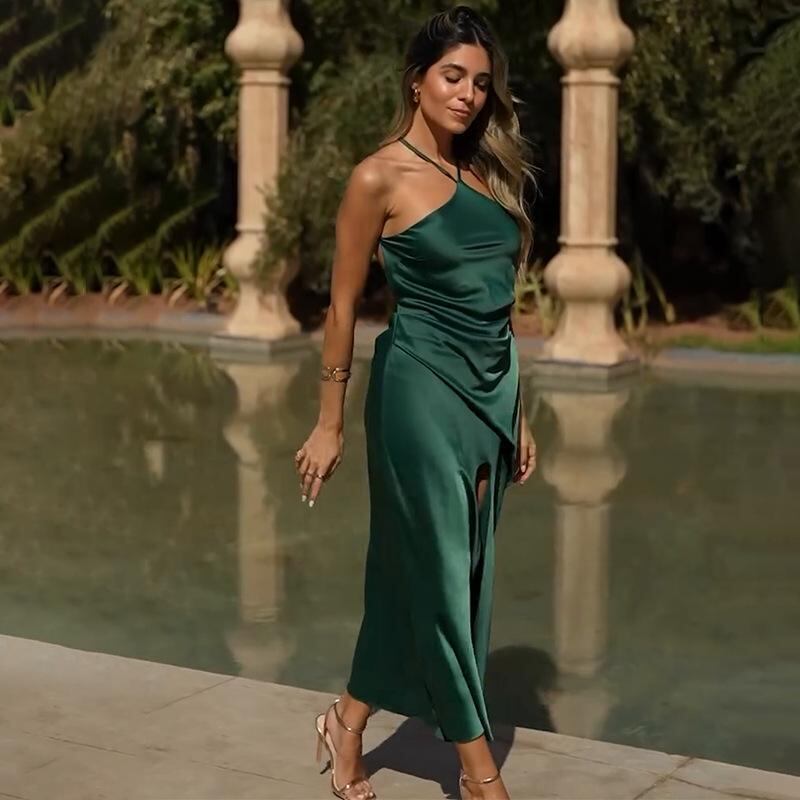 ワンピース レディース ノースリーブ ソリッドカラー ホルターネック バックオープン ロング丈 タイトスカート ポリエステル スパンデックス 高見え セクシー エレガント スタイル 墨グリーン オレンジレッド