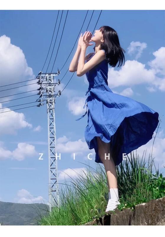 ワンピース レディース フレンチテイスト 上品 柔らかな ブルー ノースリーブ ウエストマーク Aライン 着痩せ 体型カバー 小柄向け ロング丈 夏
