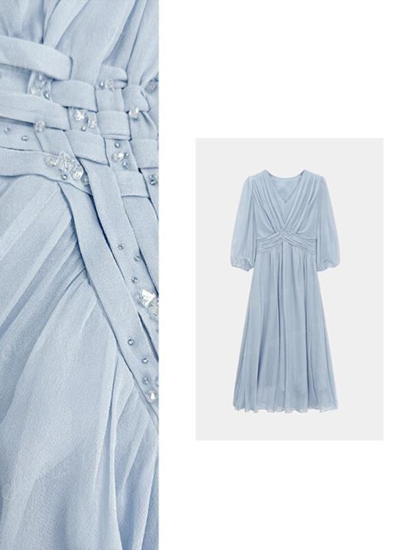 ワンピース レディース エレガント 上品 高級感 ミディ丈 Aライン Vネック 五分袖 ハイウエスト 麻 リネン 切り替え ブルー ドレス フォーマル お呼ばれ パーティー 大人 レディ