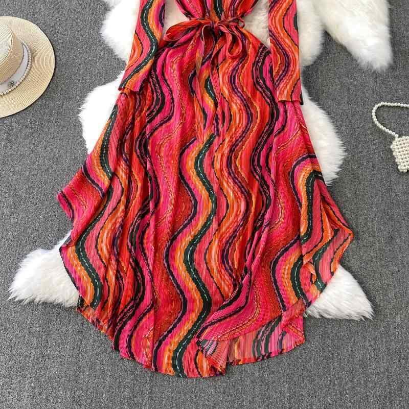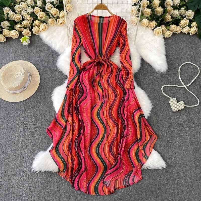 ワンピース レディース 高級感 プリーツ ストライプ 長袖 Aライン ラウンドネック ハイウエスト ウエストマーク 細見え アシンメトリー ロング丈 エレガント きれいめ 通勤 オフィス 春 レッド ブルー