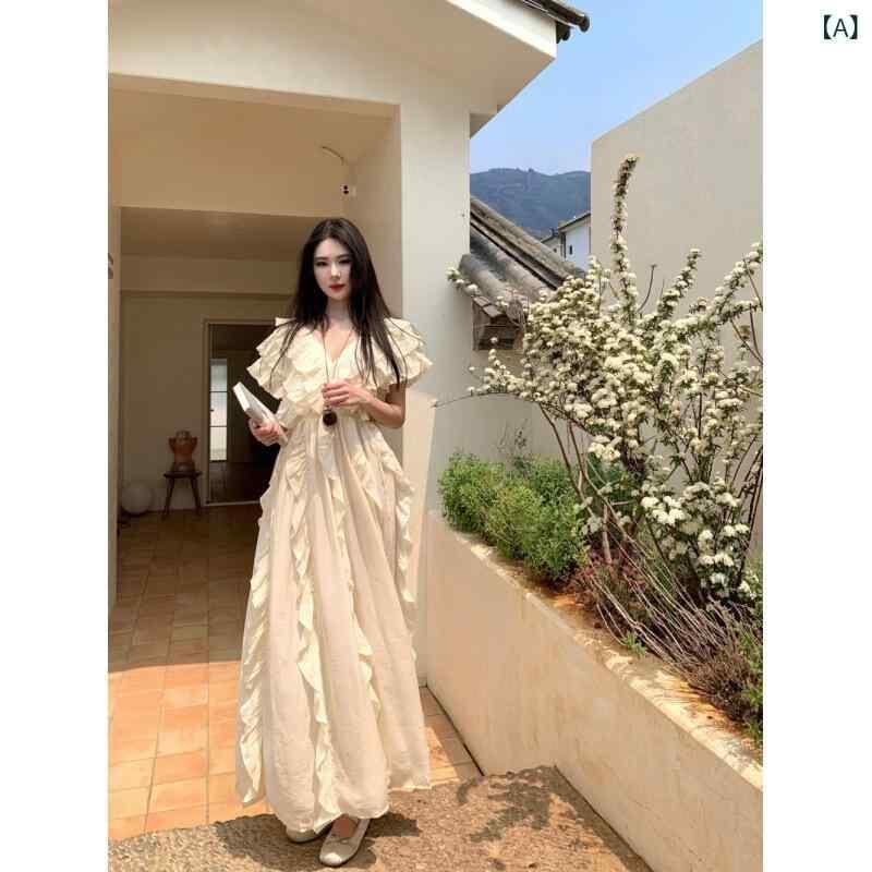 ワンピース リゾートスタイル ロング丈 マキシ丈 コットンリネン 綿麻 キャミワンピース Vネック ハイウエスト バックオープン 背中見せ 切り替え プルオーバー 無地 エレガント 上品 アイボリー オフホワイト 春夏