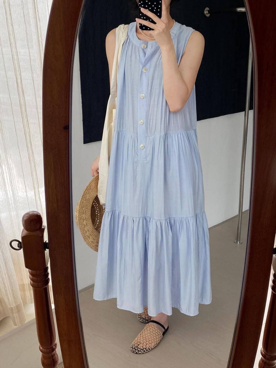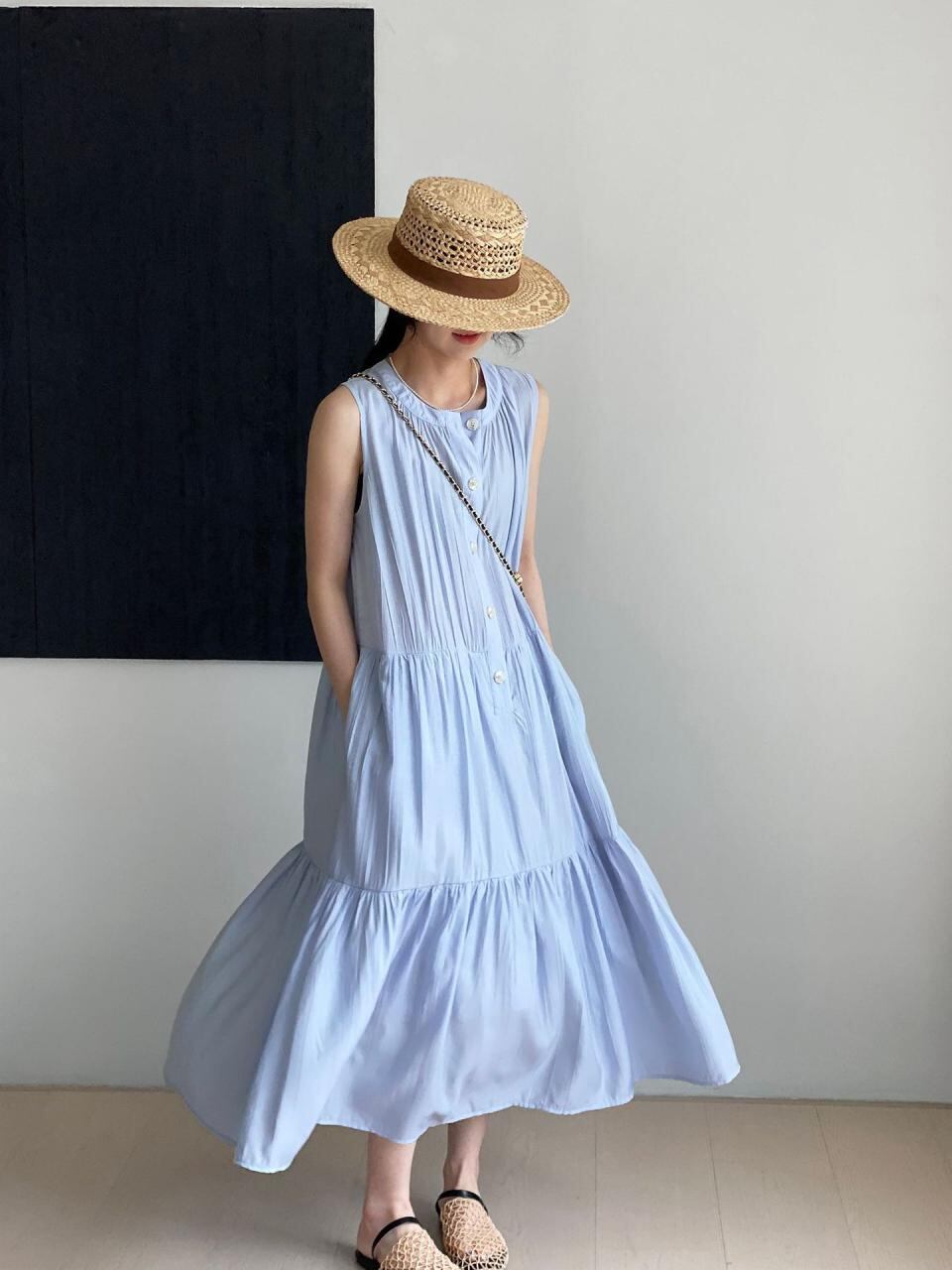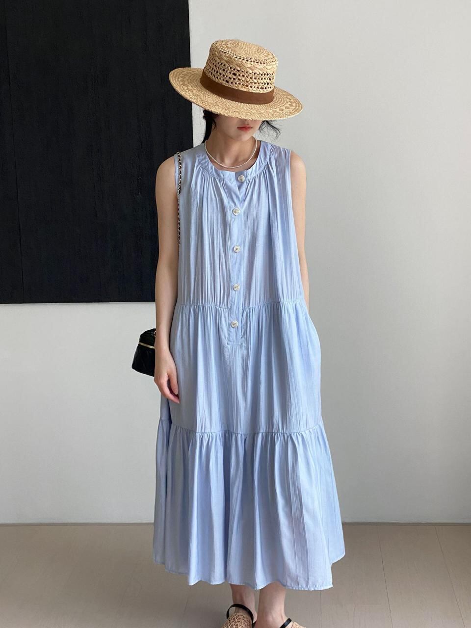 ワンピース レディース ブラック ゆったり ノースリーブ ロング丈 プリーツ ティアード 体型カバー 細見え ラウンドネック 接触冷感 テクスチャー感 カジュアル 春夏 再生繊維