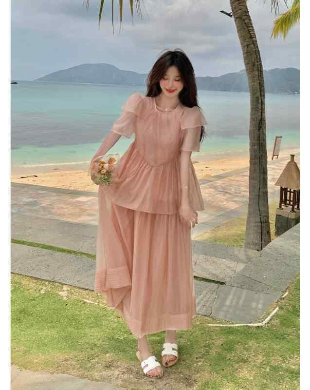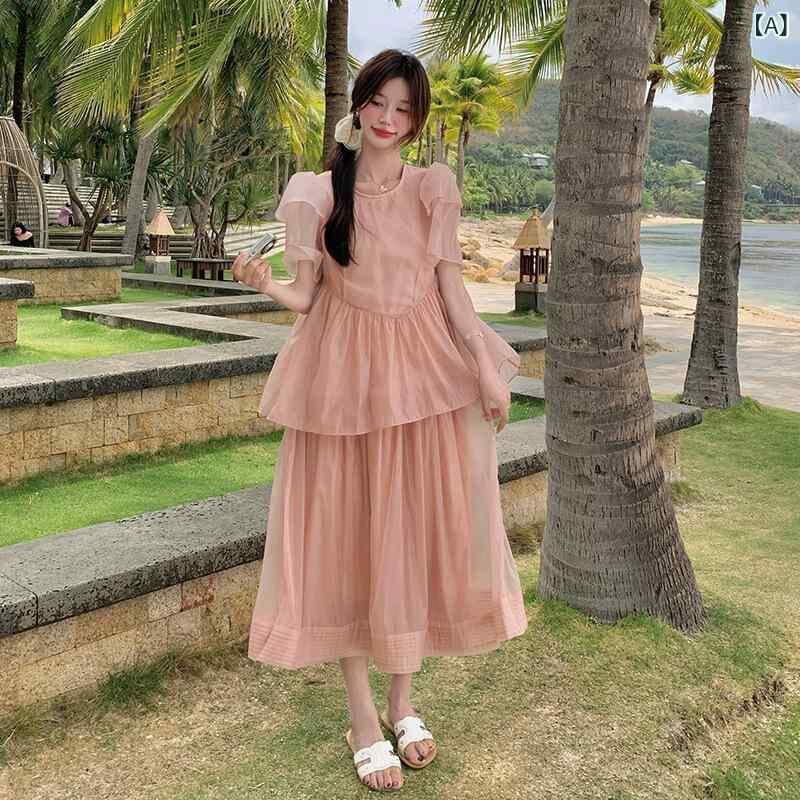 ・カテゴリ: ワンピース・スタイル: 清新スウィート・デザイン: プルオーバー・主な素材: ポリエステル繊維 70-80%・柄: 無地・加工: パッチワーク、切り替え・セット形式: 単品・スカート丈: ロング丈・スカート種類: ティアードスカート・ネックライン: ラウンドネック・袖の形: 花びら袖・袖丈: 半袖・ウエストタイプ: ハイウエスト・デザイン要素: フリル・カラー展開: ピンク・サイズ展開: S, M, L, XL