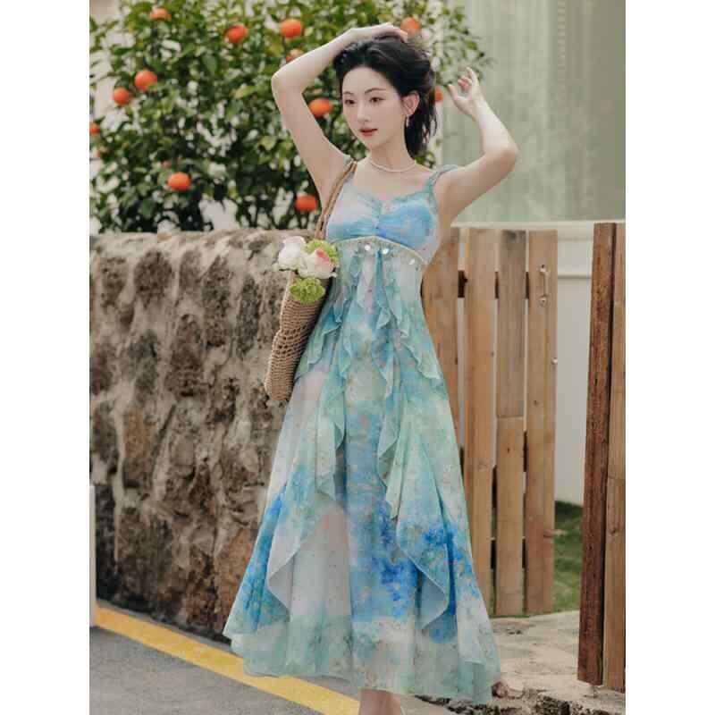 ワンピース レディース グリーン 小花柄 フリル キャミソール マキシ丈 Vネック ハイウエスト シフォン 春夏 ビーチ リゾート カジュアル レトロ