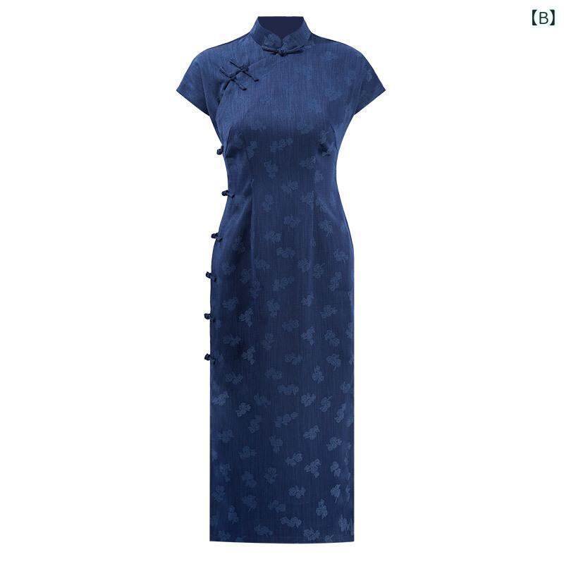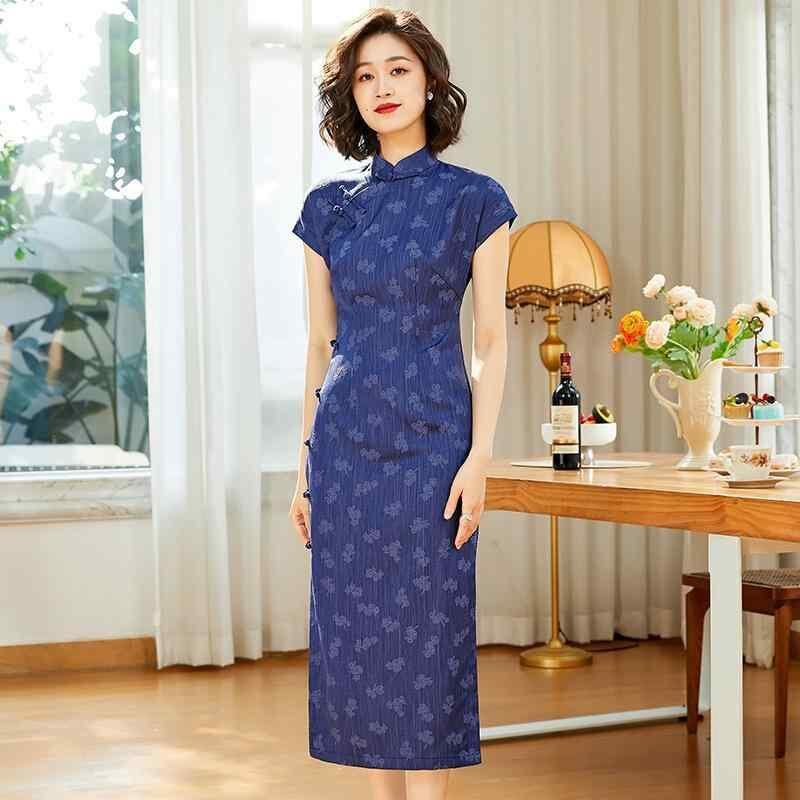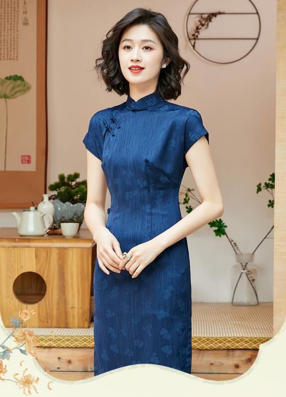 チャイナドレス レディース 女性用 チャイナ風 レトロモダン 上質 ポリエステル ロング丈 スタンドカラー 七分袖 スリット 紺色 ネイビー 青色系 春夏