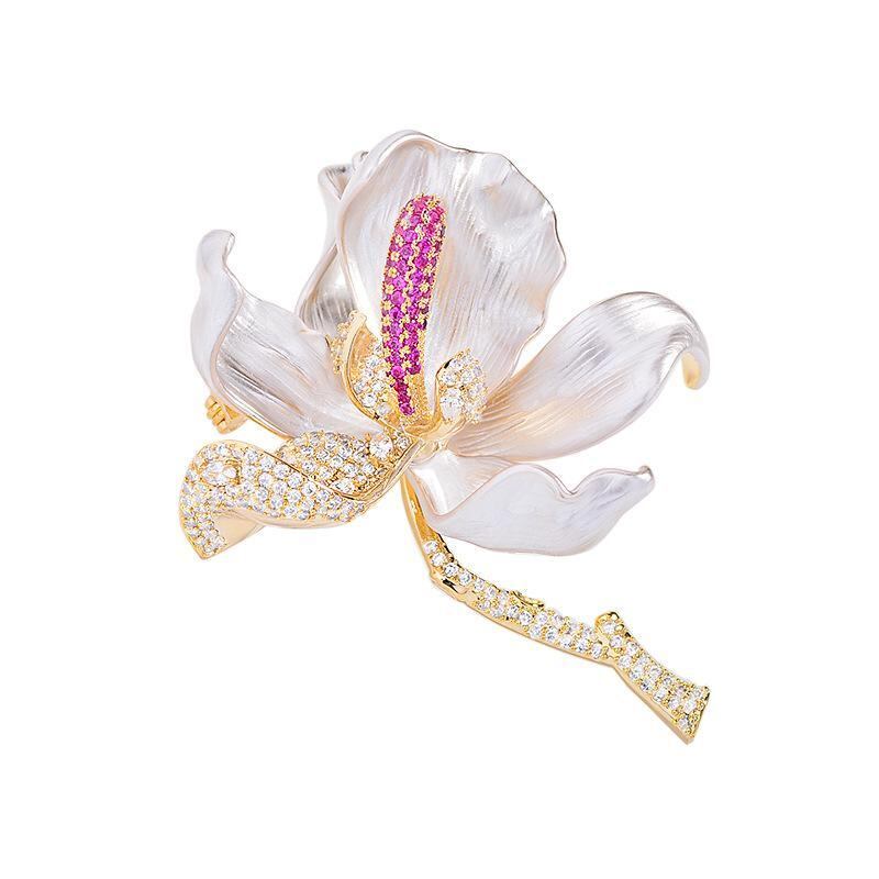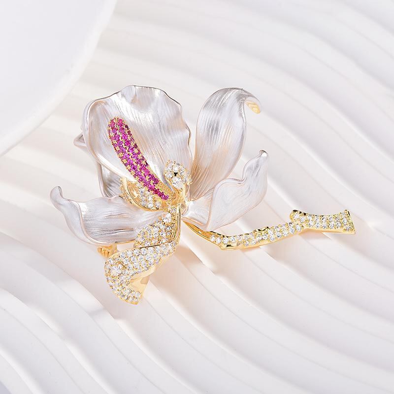 ブローチ レディース エナメル 木蓮の花 フラワーモチーフ ジルコニア 高級感 エレガント 精巧 存在感 銅製 電気メッキ加工 ゴールド ピンブローチ フォーマル 結婚式 パーティー 普段使い