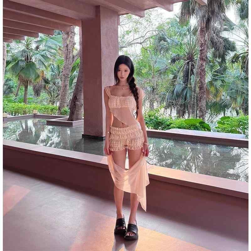 水着 ビキニ レディース セパレート ツーピース ボックスショーツ 体型カバー 上品 セクシー 大人可愛い 個性的デザイン 無地 胸パッド付き ノンワイヤー 伸縮性 アプリコット ベージュ ビーチ プール リゾート