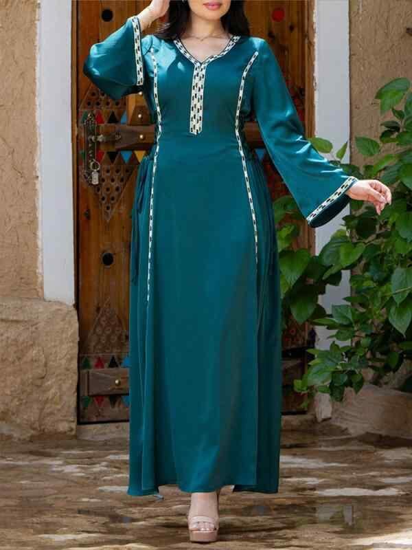 ワンピース レトロ 民族風 エスニック ロングドレス フォーマル パーティー ビーズ装飾 エレガント ゆったり Aライン Vネック 長袖 サテン ポリエステル ダークグリーン 春夏