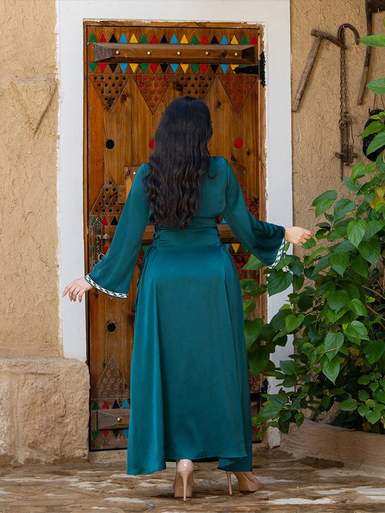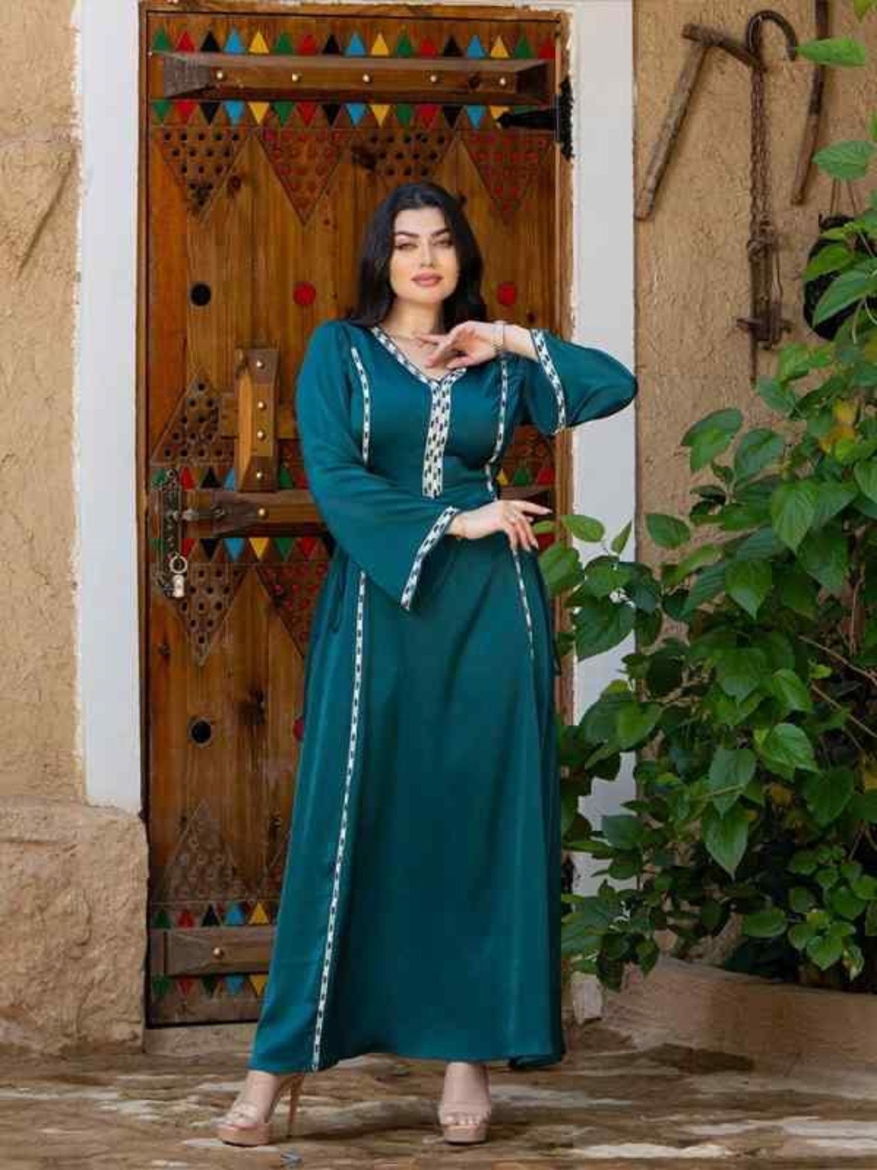 ・カテゴリ: ワンピース・スタイル: ベーシック・テイスト: レトロ、ヴィンテージ、エスニック、トライバル・主な素材: ポリエステル・主な素材混率: 95%以上・生地名: マットサテン・柄: 無地・ネックライン: Vネック・袖丈: 長袖・袖タイプ: レギュラー・スカート丈: ロング・スカートシルエット: Aライン・ウエスト: ゆったり・デザイン特徴: ビーズ装飾・形式: 単品・カラー: ダークグリーン・サイズ展開: S, M, L, XL