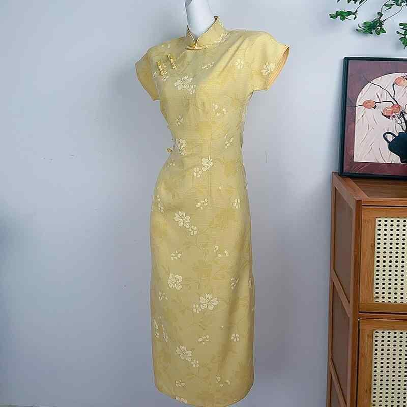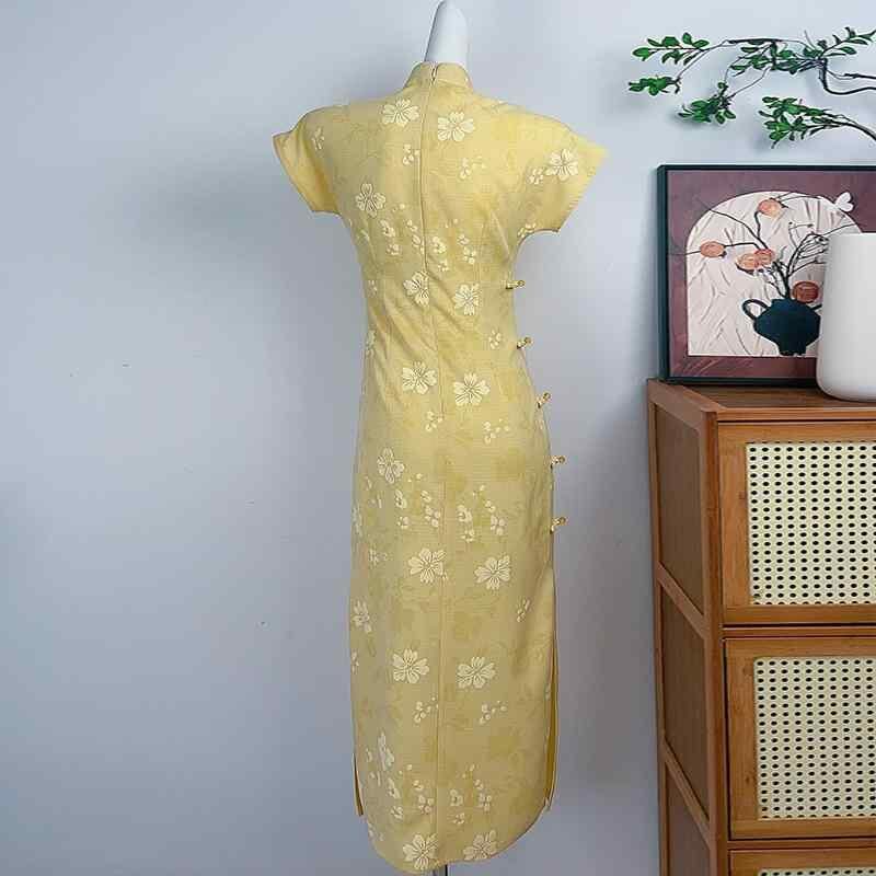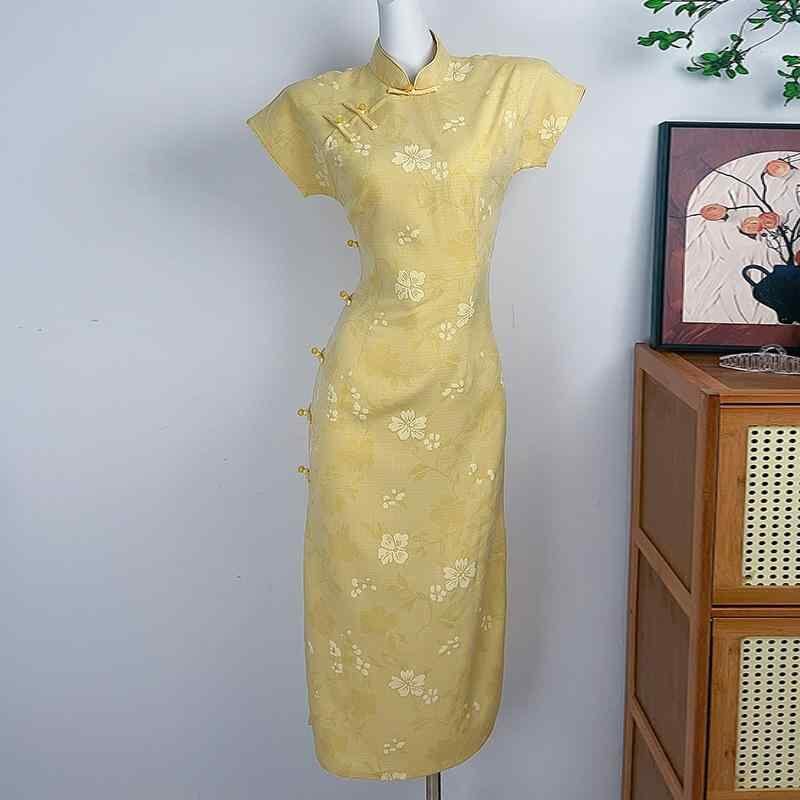 チャイナドレス レディース ワンピース ソフト 新中華風 黄色 チーパオ 夏 ロング丈 エレガント デイリー 女性用