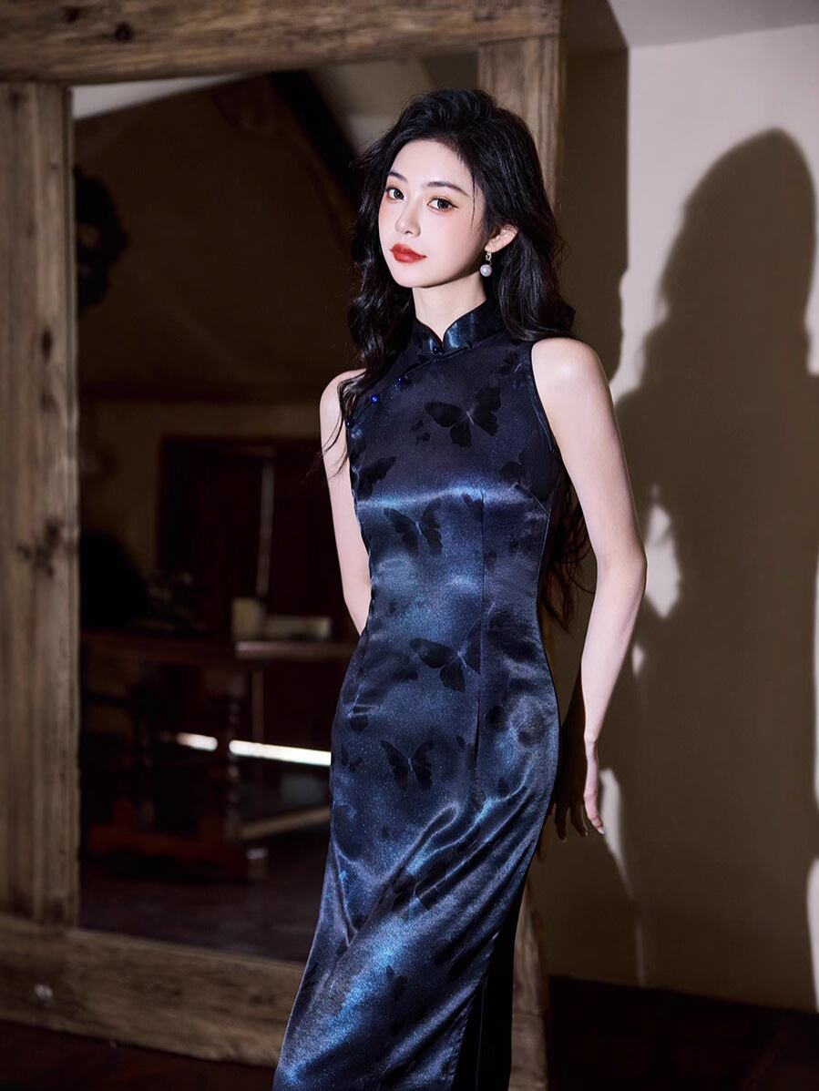 チャイナドレス ノースリーブ スタイリッシュ レディース 中国風 春夏 レトロ 流金サテン オーロラカラープリント ロング丈 スリムフィット 細見え