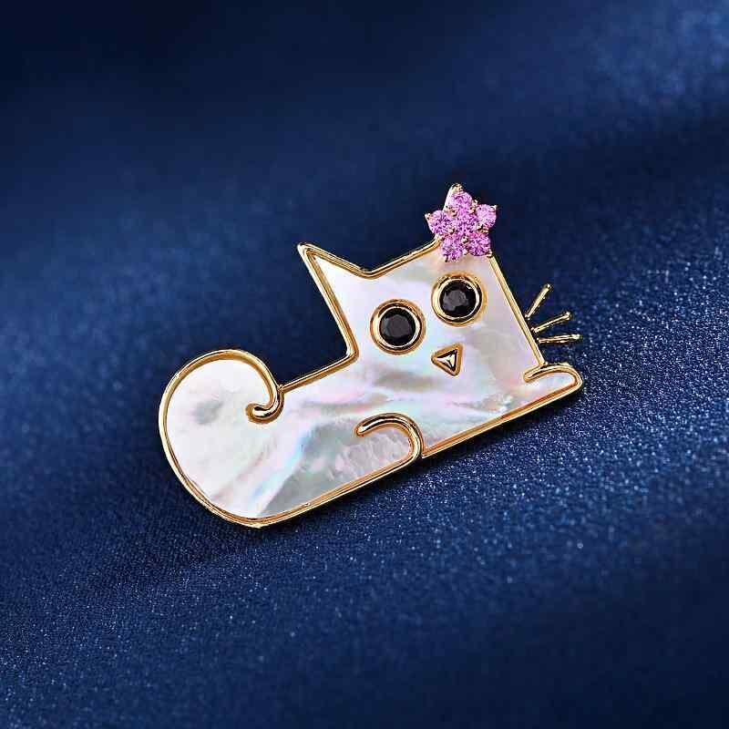 ブローチ レディース 天然シェル 猫モチーフ 金色 銅 ジルコニア 電気メッキ加工 かわいい 上品 エレガント 精巧 万能 春夏 アクセサリー