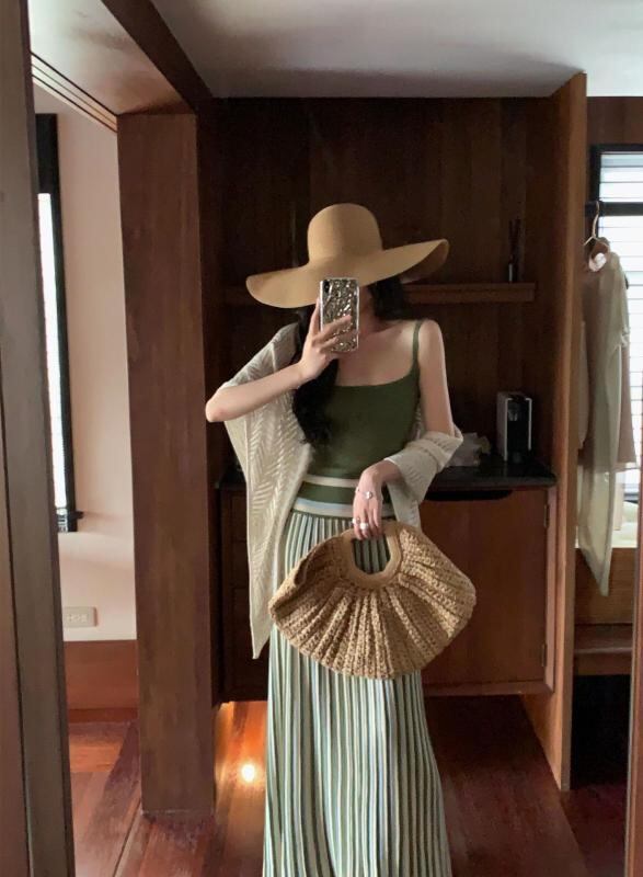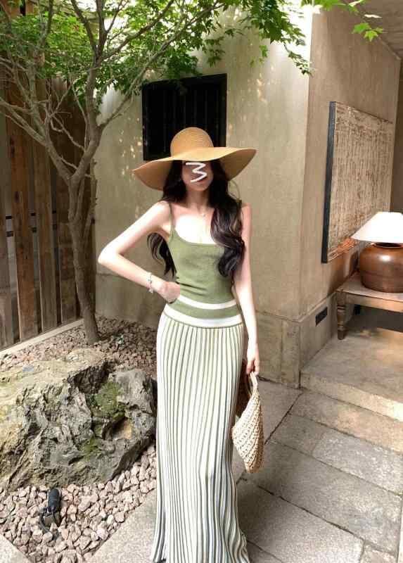 ワンピース レディース キャミソールワンピース ニット ロング丈 マキシ丈 ハイウエスト プリーツ リゾート バカンス ビーチウェア 接触冷感 ポリエステル グリーン 夏 上品 エレガント