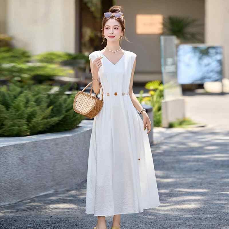 ワンピース レディース フレンチリゾート Vネック ノースリーブ スタイルアップ ウエストマーク ロング丈 Aライン エレガント きれいめ 春夏 ポリエステル アイボリー
