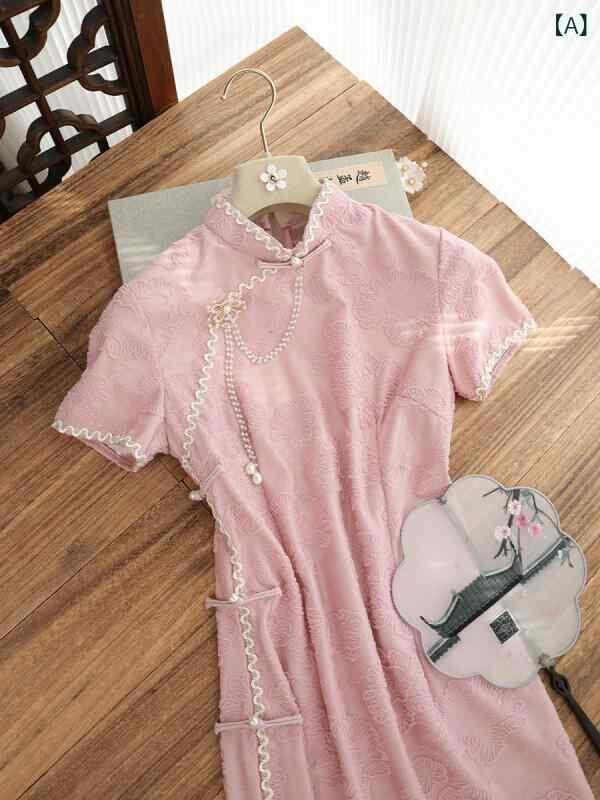 チャイナドレス レディース ピンク レトロ モダンデザイン 半袖 スタンドカラー 斜め襟 ロング丈 ポリエステル スパンデックス 春夏 普段使い
