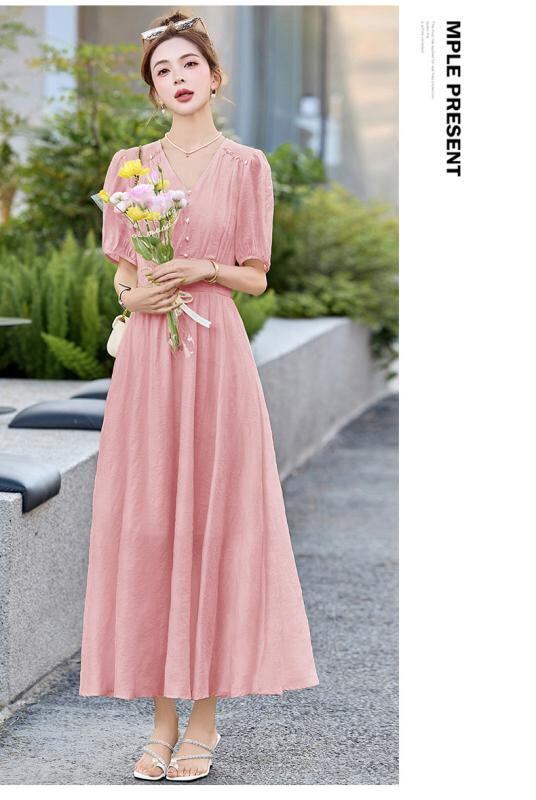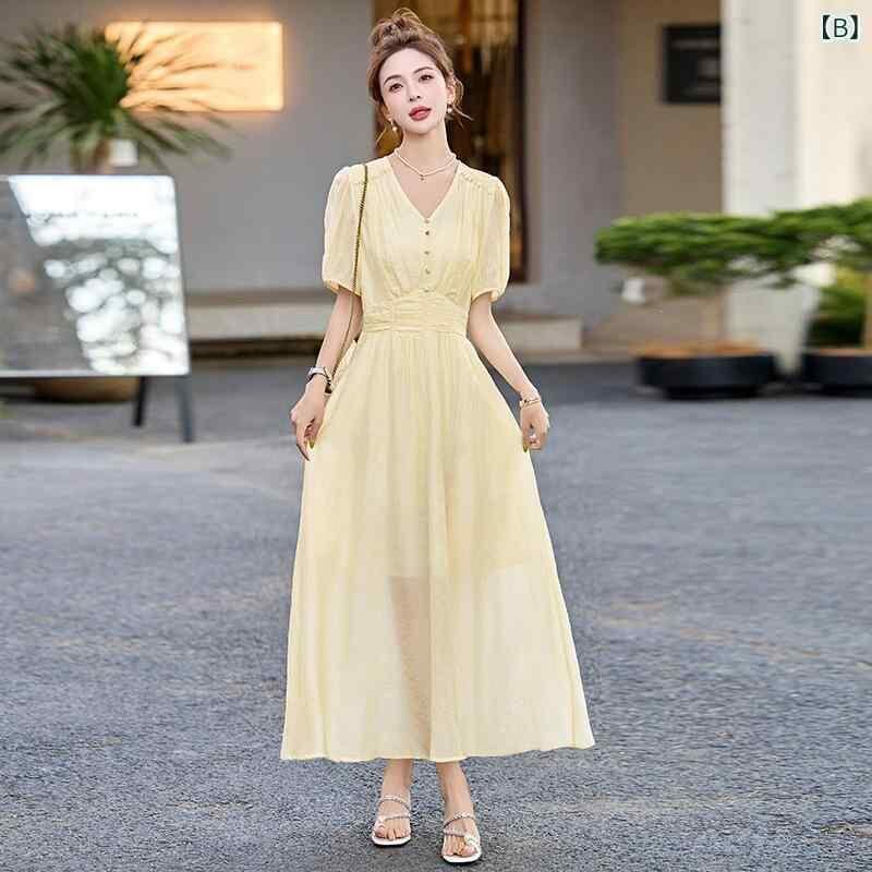 ワンピース レディース 春夏 再生繊維 ミディ丈 Aライン Vネック 半袖 ハイウエスト 切り替え 無地 エレガント 上品 通勤 オフィス きれいめ 大人 クール デザイン 高級感 お出かけ ブルー イエロー ピンク