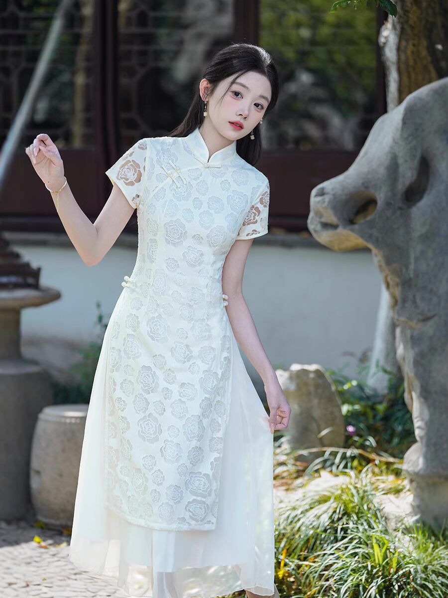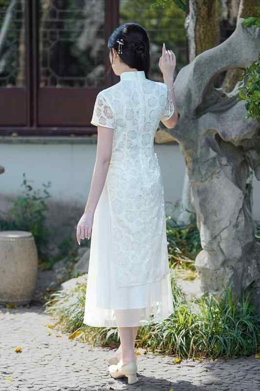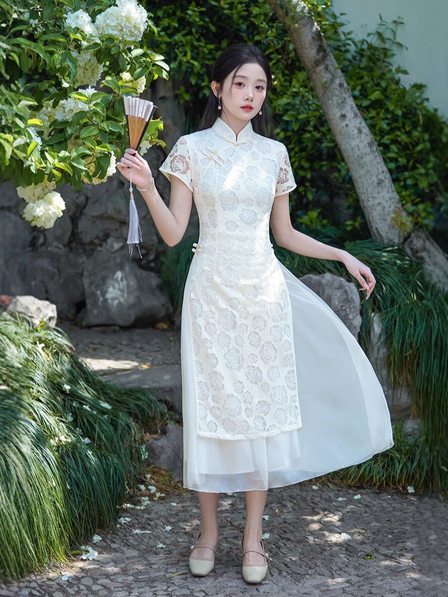 チャイナドレス レディース 春夏 改良 レース アオザイ マキシ丈 普段使い ウエストマーク フレアスカート ポリエステル スタンドカラー 七分袖 エレガント 伸縮性 ホワイト