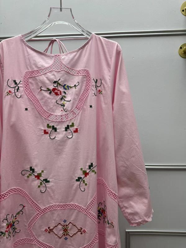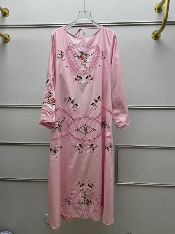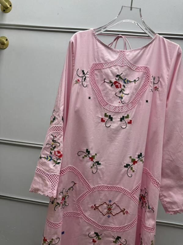 ワンピース フレンチテイスト レトロ 透かし刺繍 バックオープン ラウンドネック ネックリボン フレア袖 ロング丈 コットン 花柄 Aライン ウエストゴム ピンク 春夏 エレガント