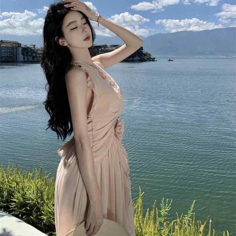 商品仕様: ・素材: ポリエステル、スパンデックス ・柄: 無地 ・スタイル: リゾート ・袖丈: ノースリーブ ・ネックライン: ホルターネック ・スカート丈: ロング ・シルエット: Aライン ・カラー展開: ピンク、紫 ・サイズ展開: S、M、L ・その他: 襟元フリル、背中開き