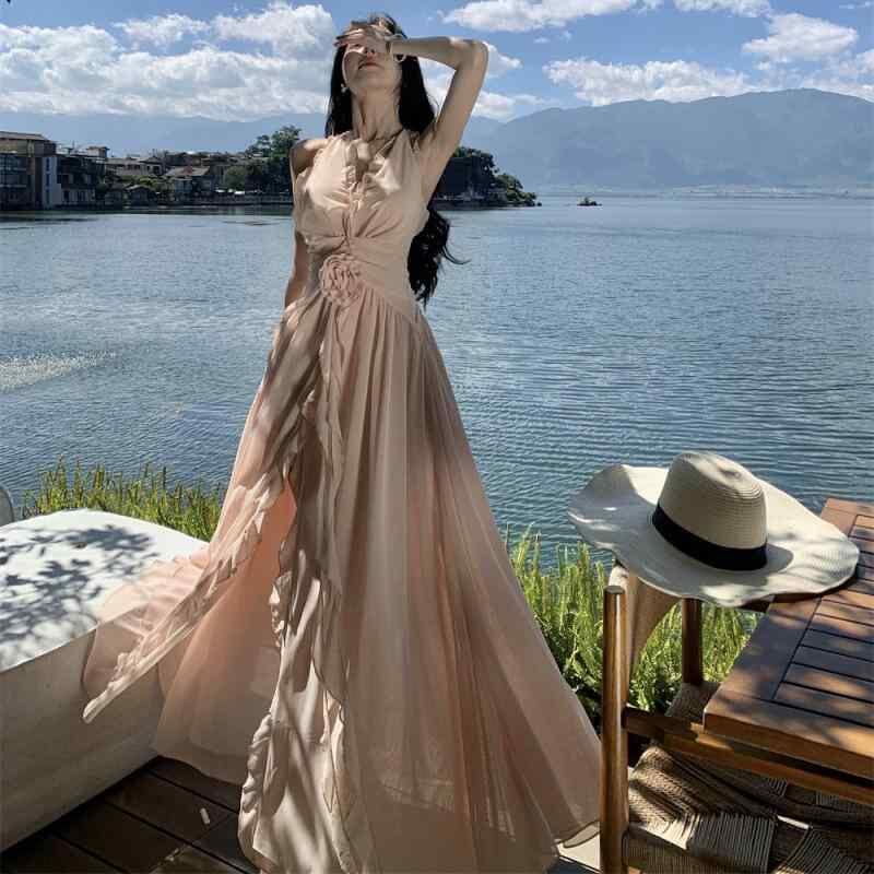 ワンピース レディース ノースリーブ halterneck ロング Aライン チュール 無地 ピンク系 パープル 普段使い リゾート 旅行 高見え ポリエステル
