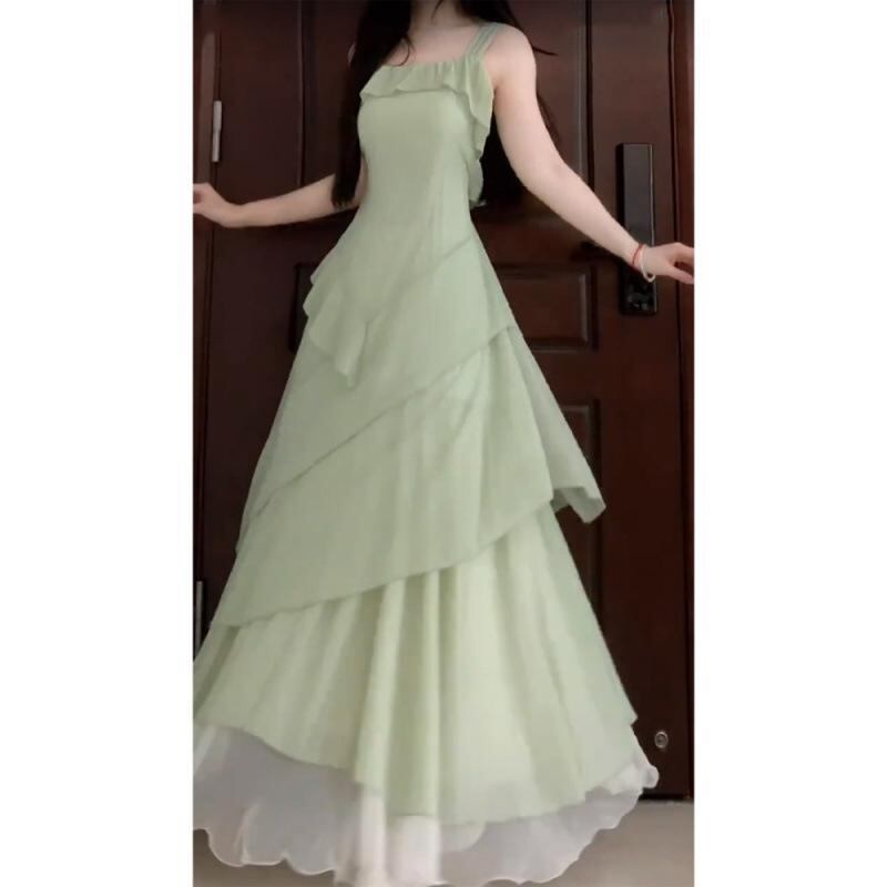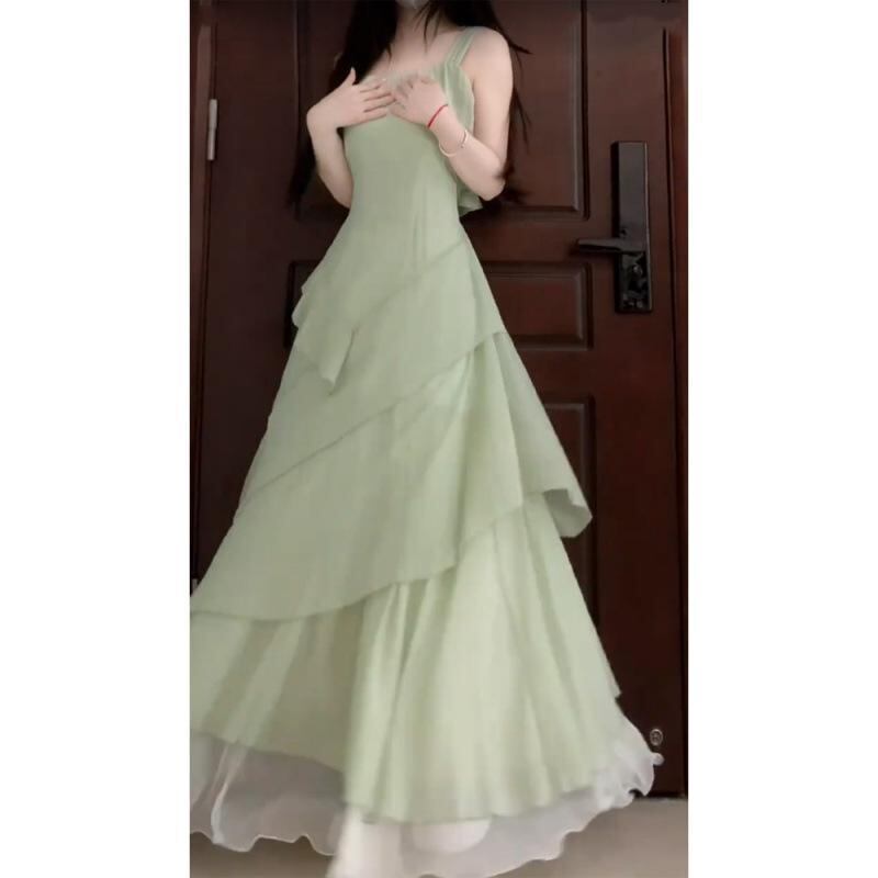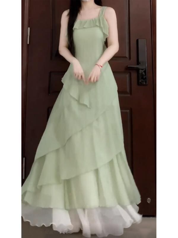 ワンピース フレンチリゾート風 ウエストマーク 高級感 イレギュラーヘム フリル 配色 ロング丈 麻 リネン バックオープン ノースリーブ 抹茶グリーン 夏