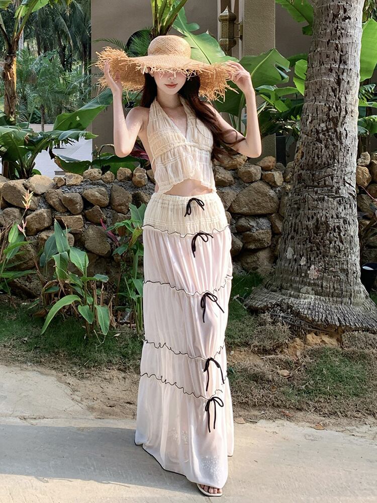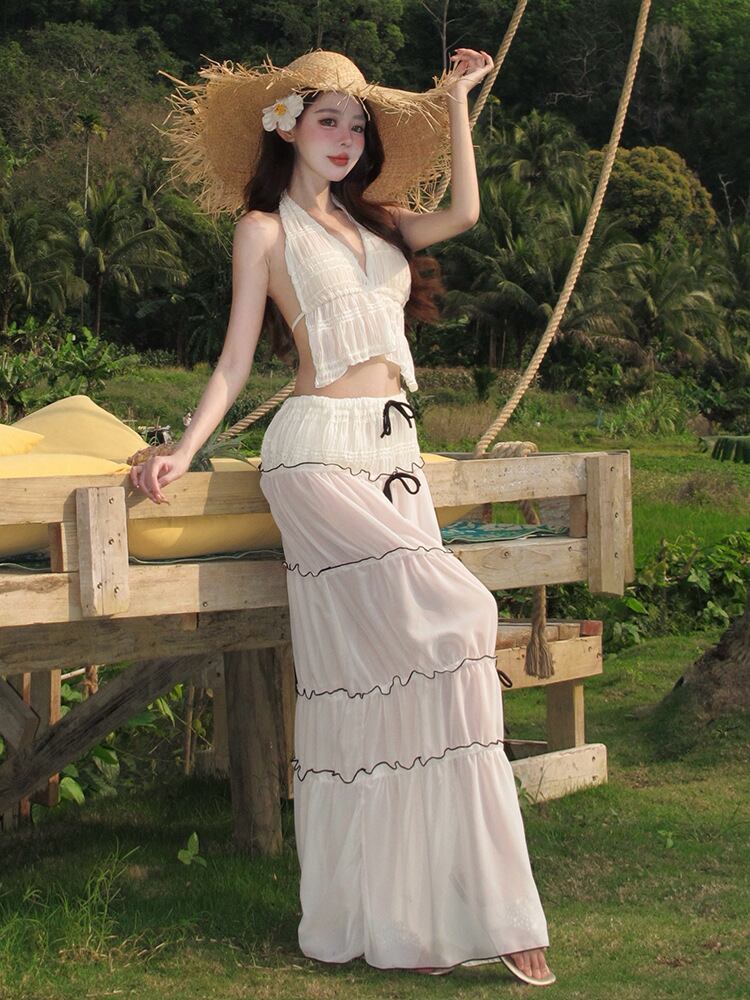 水着 レディース ビキニ セパレート スリーピース ハイウエスト ロングスカート付き 速乾性 ナイロン スパンデックス リゾート ビーチ 海水浴 春夏 ホワイト イエロー 体型カバー スイムウェア