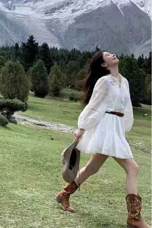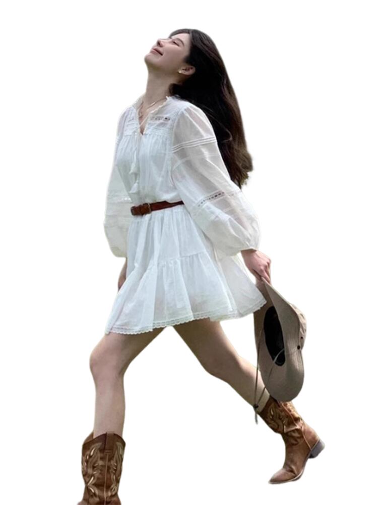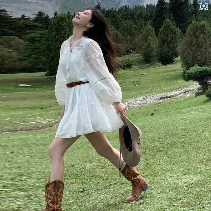 ワンピース レディース フレンチ Vネック 長袖 シャツワンピース 膝上丈 TR素材 無地 中国風 ハイウエスト 文艺复古 リゾート 旅行