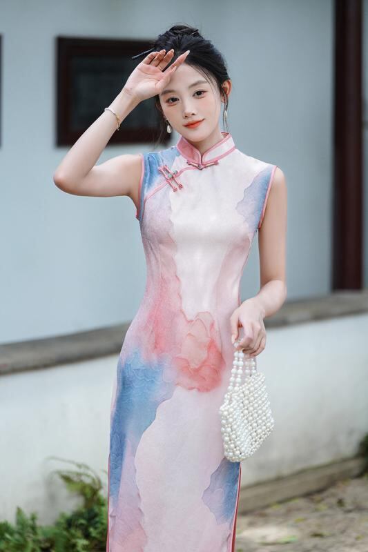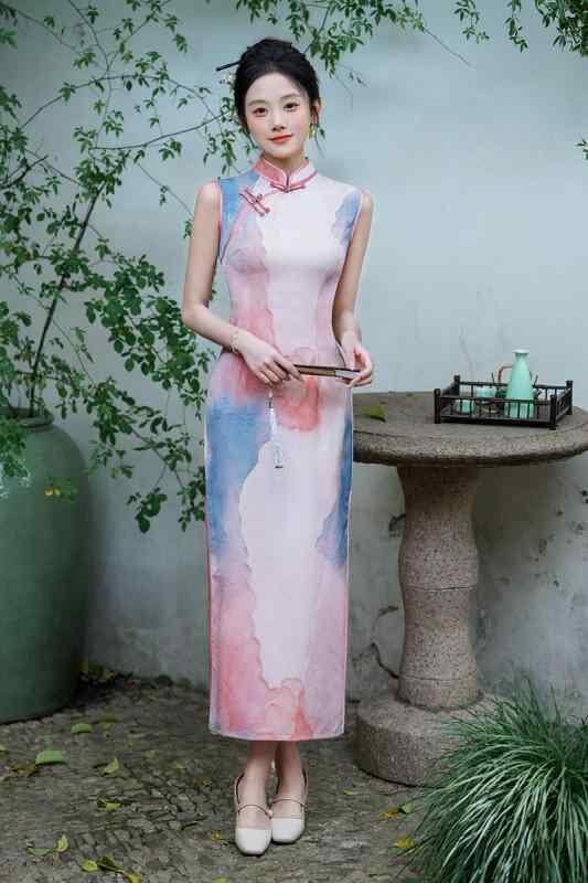 チャイナドレス ノースリーブ スタイリッシュ レディース 中国風 春夏 ジャカード織り 両面プリント ロング丈 レトロ 女性用 スタイルアップ 細見え