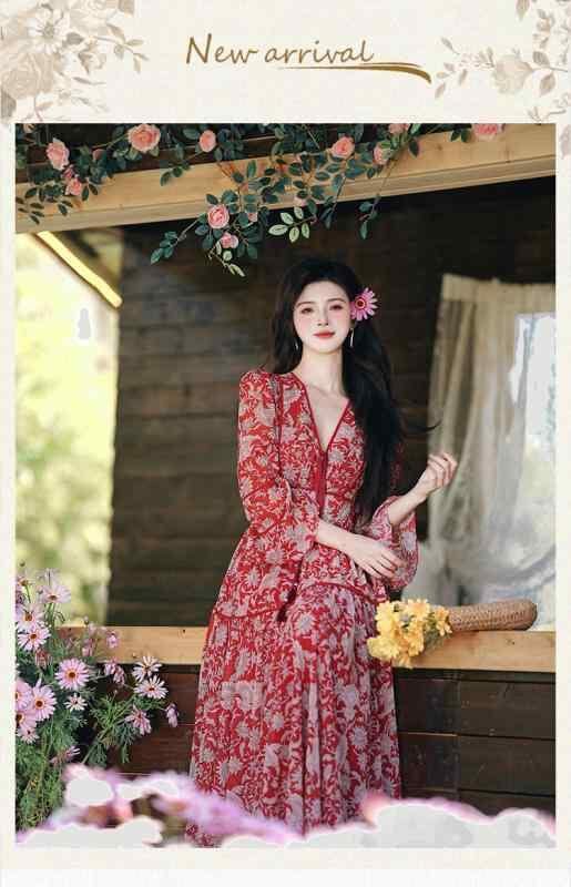 ・カテゴリ: ワンピース・スタイル: レトロ・デザイン: ベーシック・主な素材: ポリエステル90%~95%・加工: プリント・セット内容: 単品・スカート丈: ミディ丈・スカートデザイン: フリル・ネックライン: Vネック・袖タイプ: レギュラー・袖丈: 長袖・ウエスト: ハイウエスト・デザインポイント: リボン、裏地・カラー: レッド・サイズ展開: S、M、L・フロント: ファスナー