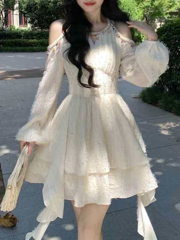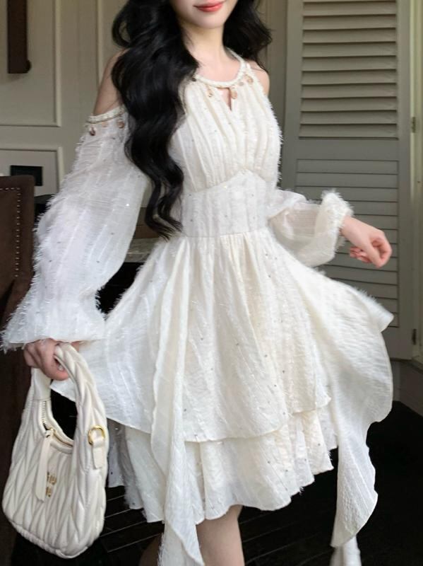 ワンピース レディース オフショルダー スパンコール ウエストマーク 長袖 ラウンドネック ハイウエスト Aライン ミモレ丈 ポリエステル 伸縮性 アイボリー 春夏