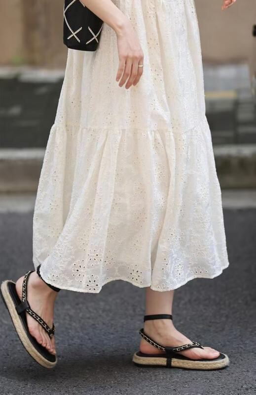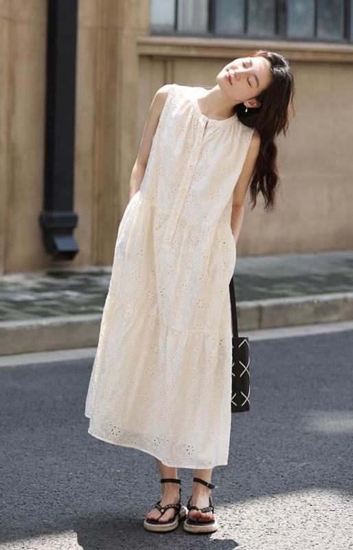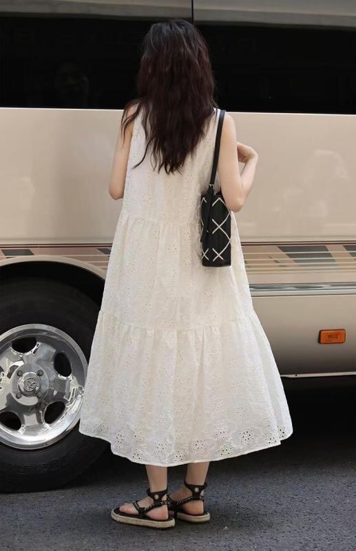 ワンピース レディース フレンチスタイル 凝った鍵編み テンセル綿 ノースリーブ ドレス リゾート 上品な質感 ラウンドネック ミディ丈 オフホワイト 春夏