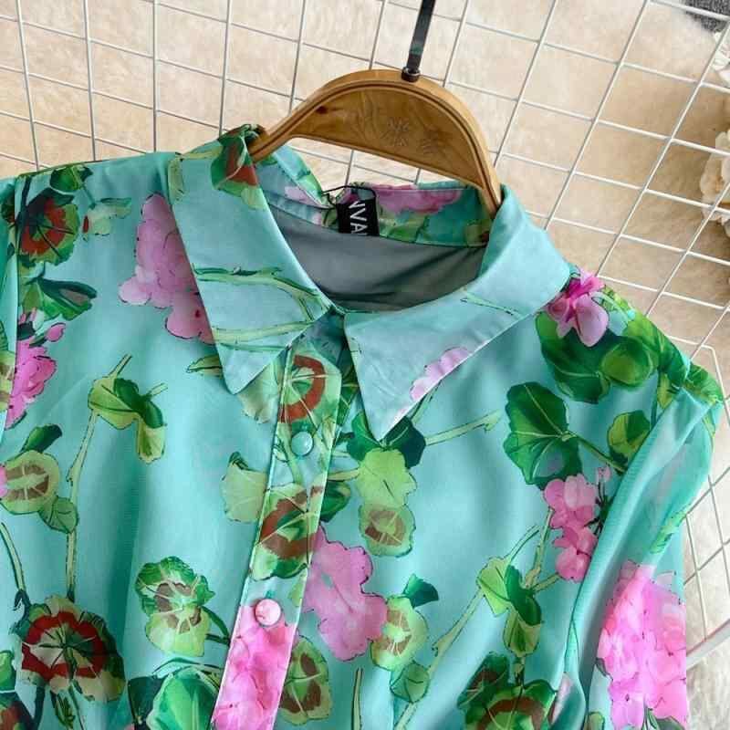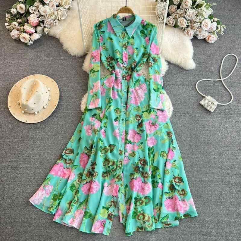 ワンピース レディース 長袖 ポロ襟 ウエストマーク 細見え効果 Aライン ロング丈 花柄 プリント シャツワンピース 前開きボタン レトロ クラシカル きれいめ 上品 ポリエステル グリーン