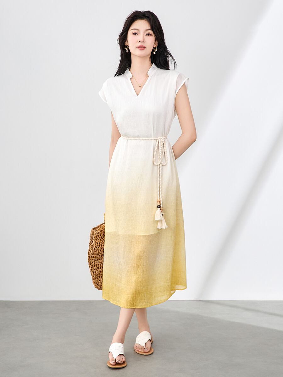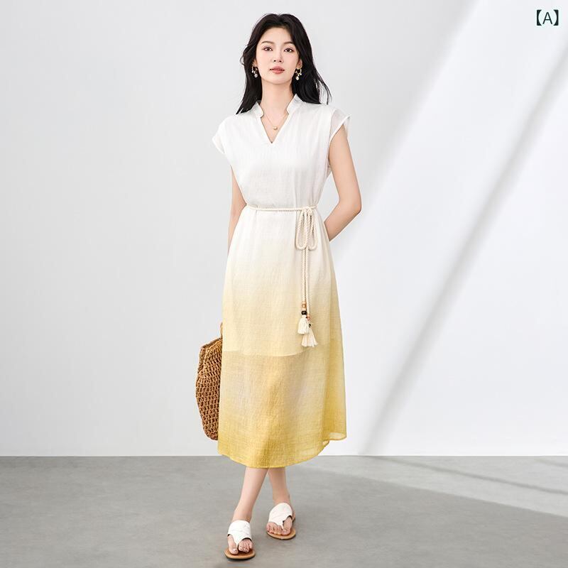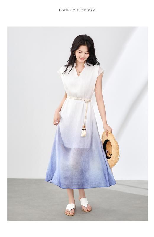 ワンピース レディース テンセル麻 ロング丈 ゆったり リラックス グラデーション ぼかし染め エレガント Vネック ノースリーブ リゾート フレンチスタイル 春夏