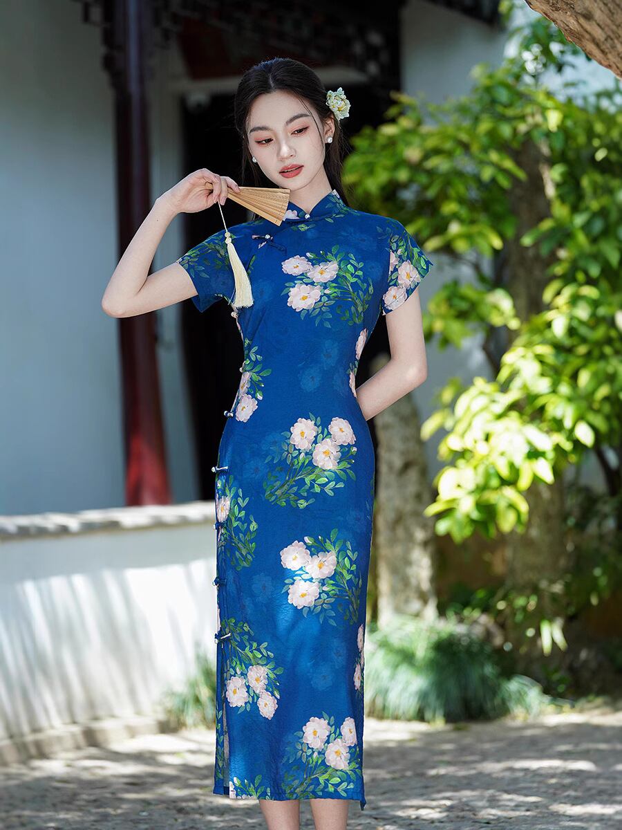 チャイナドレス レディース 春夏 チャイナ風 ラミー ロング丈 前開き レトロモダン 改良型 スリム スタンドカラー 五分袖 ハイウエストスリット ワンピース