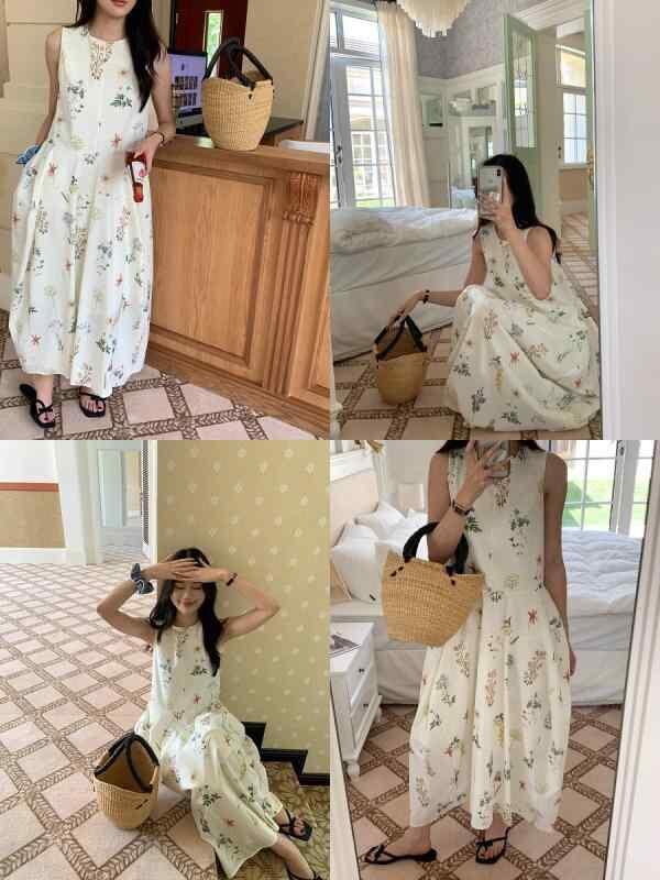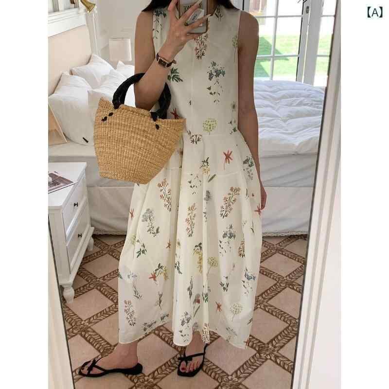 ワンピース レディース ノースリーブ 韓国風 ボタニカル柄 小花柄 ラウンドネック 丸首 ゆったり ルーズ ロング丈 マキシ丈 ハイウエスト 綿 コットン ポリエステル 通勤 オフィス カジュアル きれいめ 普段使い 夏