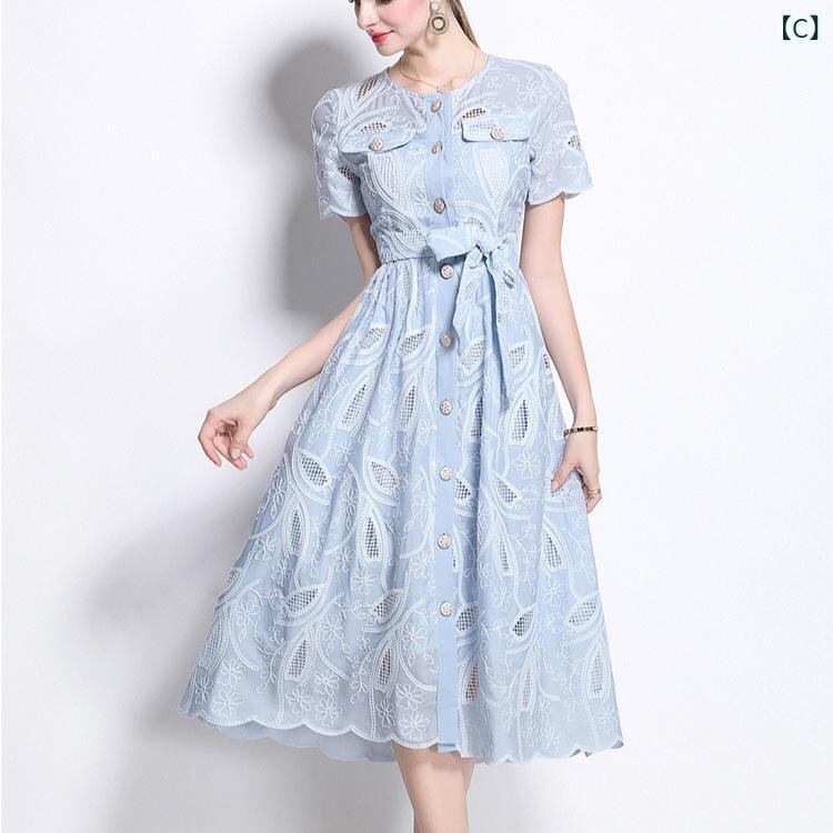 ワンピース レディース 春夏 レトロ 凝った カットワーク 刺繍 ラウンドネック ウエストマーク 半袖 着痩せ 細見え 前開き ボタン ロング丈 Aライン ドレス 通勤 オフィス