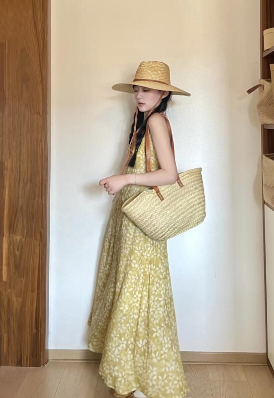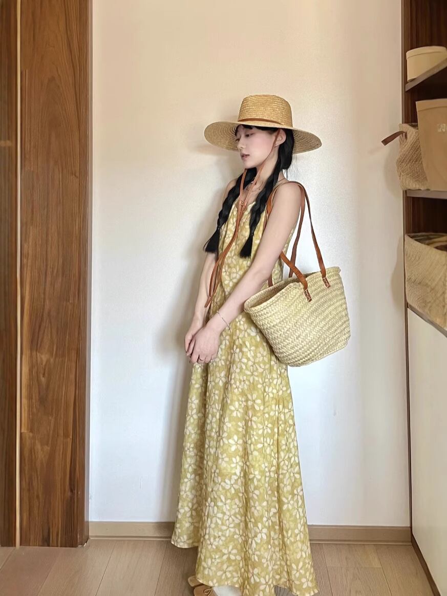 ワンピース レディース ラミー 苧麻 ナチュラル感 手描きプリント 花柄 軽やか ゆったり ノースリーブ フレンチスタイル フレア 夏 ロング丈 ラウンドネック レトロ イエロー リゾート