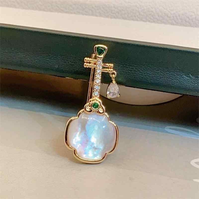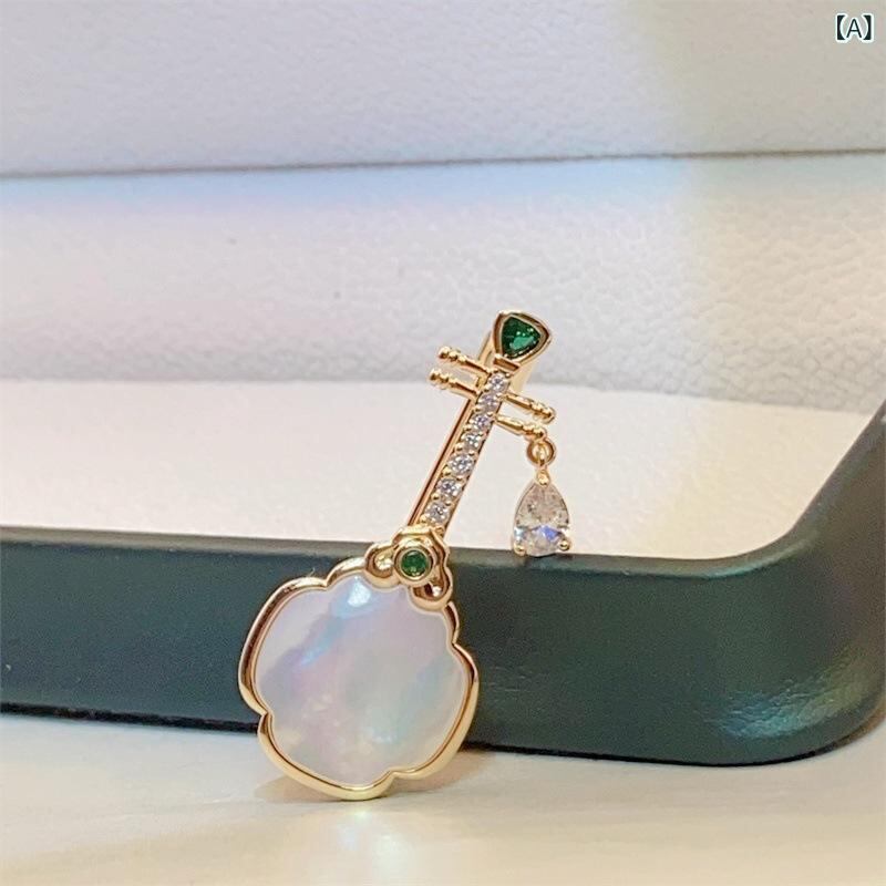 胸ブローチ レディース 天然シェル 琵琶モチーフ 中国風 新中式 高級感 上品 エレガント スーツ ジャケット フォーマル ピンブローチ 銅製 電気メッキ加工 レトロ アンティーク風 ファッション小物