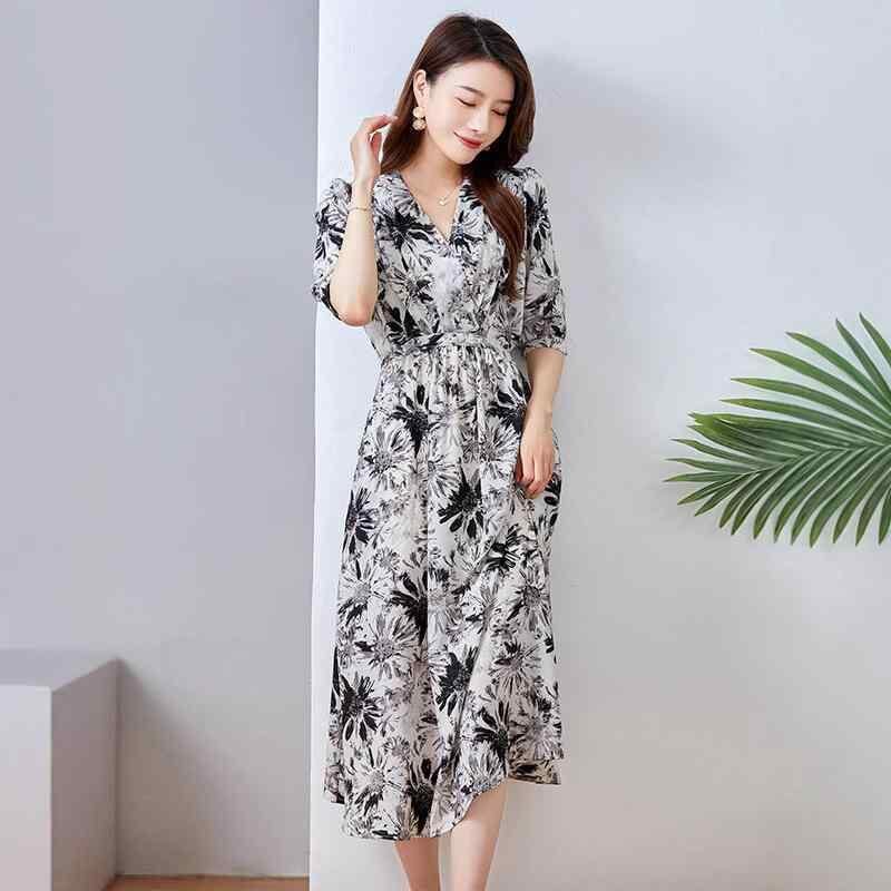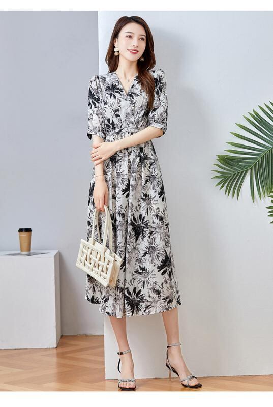 ワンピース レディース 春夏 ミディ丈 ミドル丈 シルク シフォン Vネック 小花柄 フラワープリント ウエストマーク ウエストシェイプ 着痩せ スタイルアップ 半袖 ショートスリーブ エレガント きれいめ 上品 通勤 オフィス カジュアル