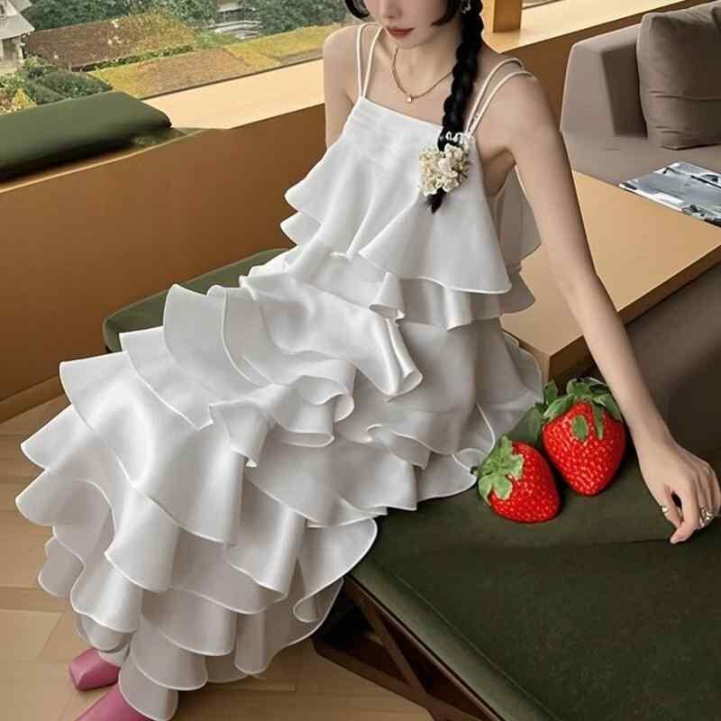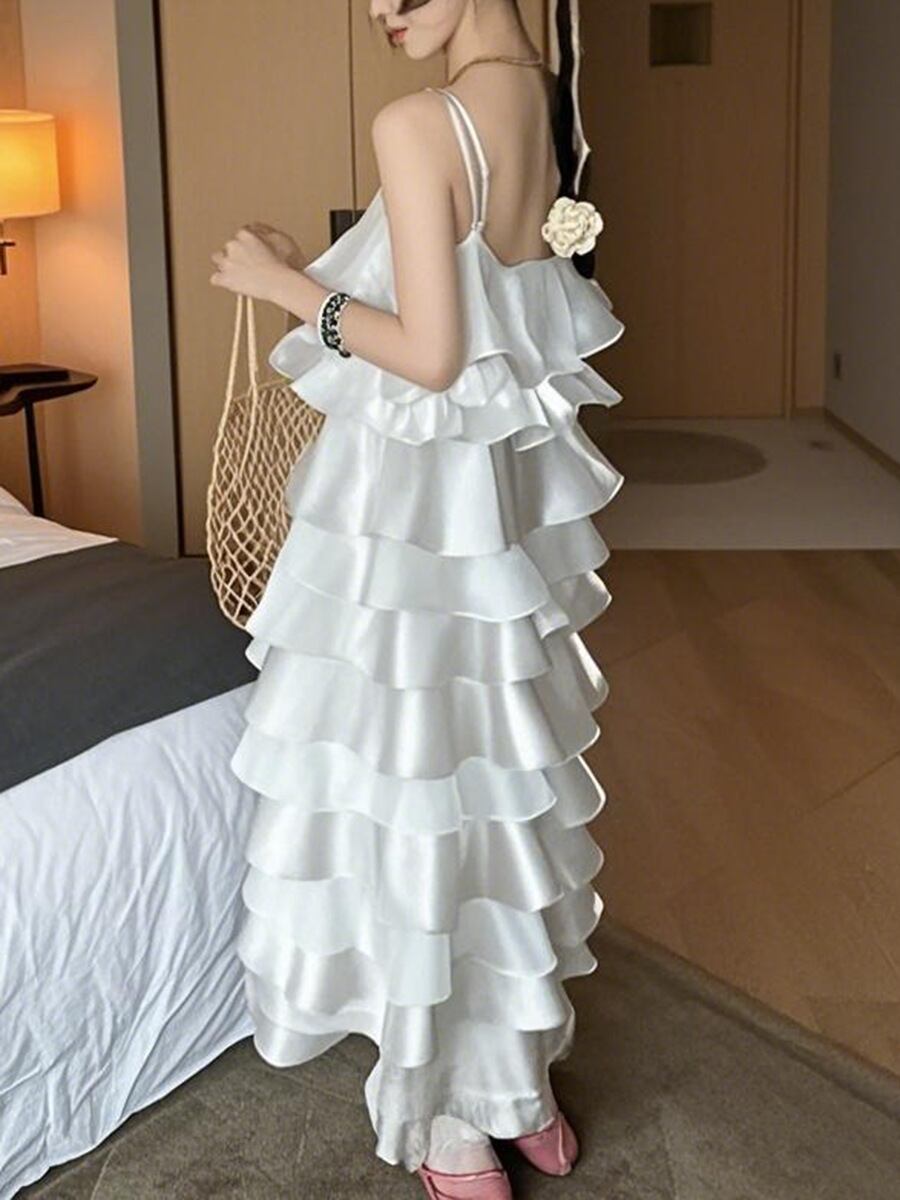 ワンピース レディース エレガント キャミソール ロング丈 オフショルダー ノースリーブ レイヤード フリル 切り替え 無地 ポリエステル コットン ミドルウエスト アシンメトリー 夏