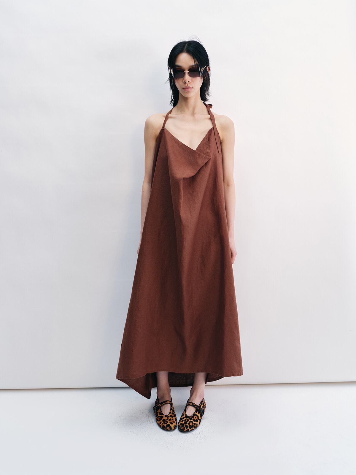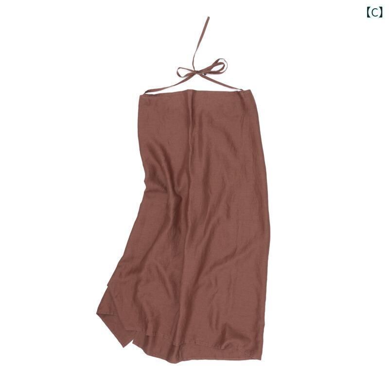 ワンピース レディース リネン 麻 キャミソール ドレス バックオープン アシンメトリー ホルターネック ロング丈 ギャザー フレア リゾート バカンス カジュアル 春夏 ノースリーブ ブラック クールグレー オレンジブラウン