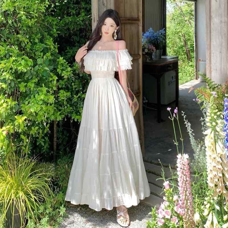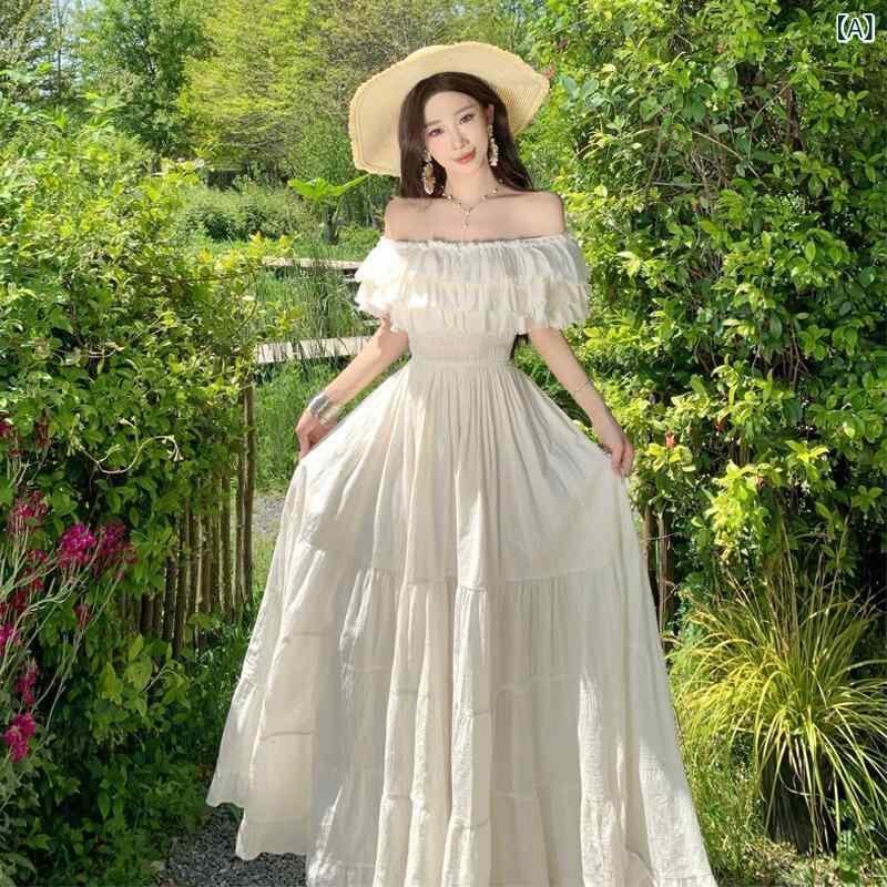 ワンピース レディース フレンチスタイル オフショルダー ウエストシェイプ ロングスカート ポリエステル 杏色 エレガント 高見え フェミニン