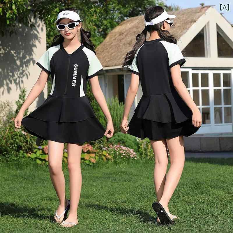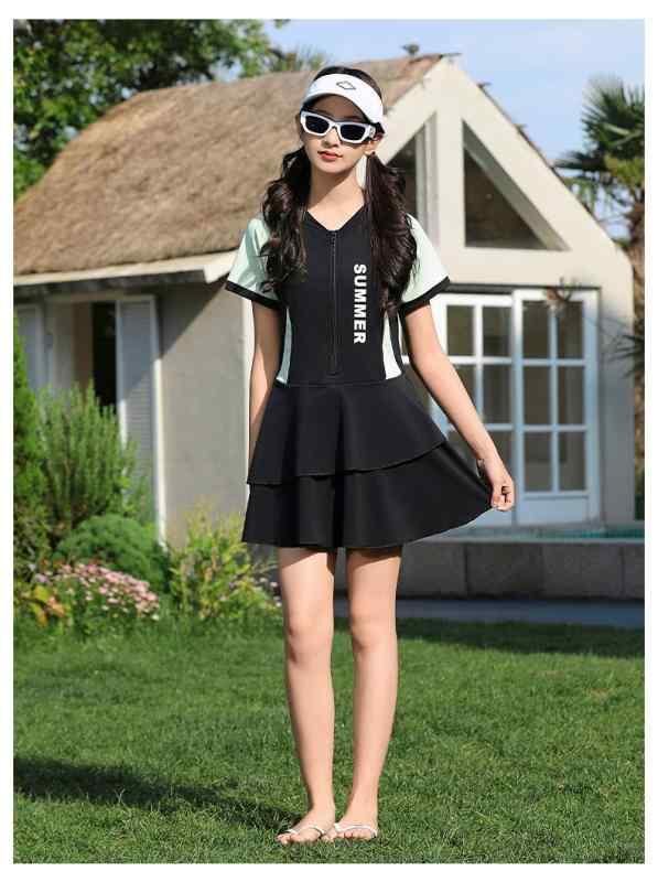 水着 ジュニア 女の子 ガールズ ワンピース オールインワン スカパン スカート付き 速乾 体型カバー ゆったり 大きいサイズ 温泉 ビーチ 海水浴 プール ナイロン素材 ブラック